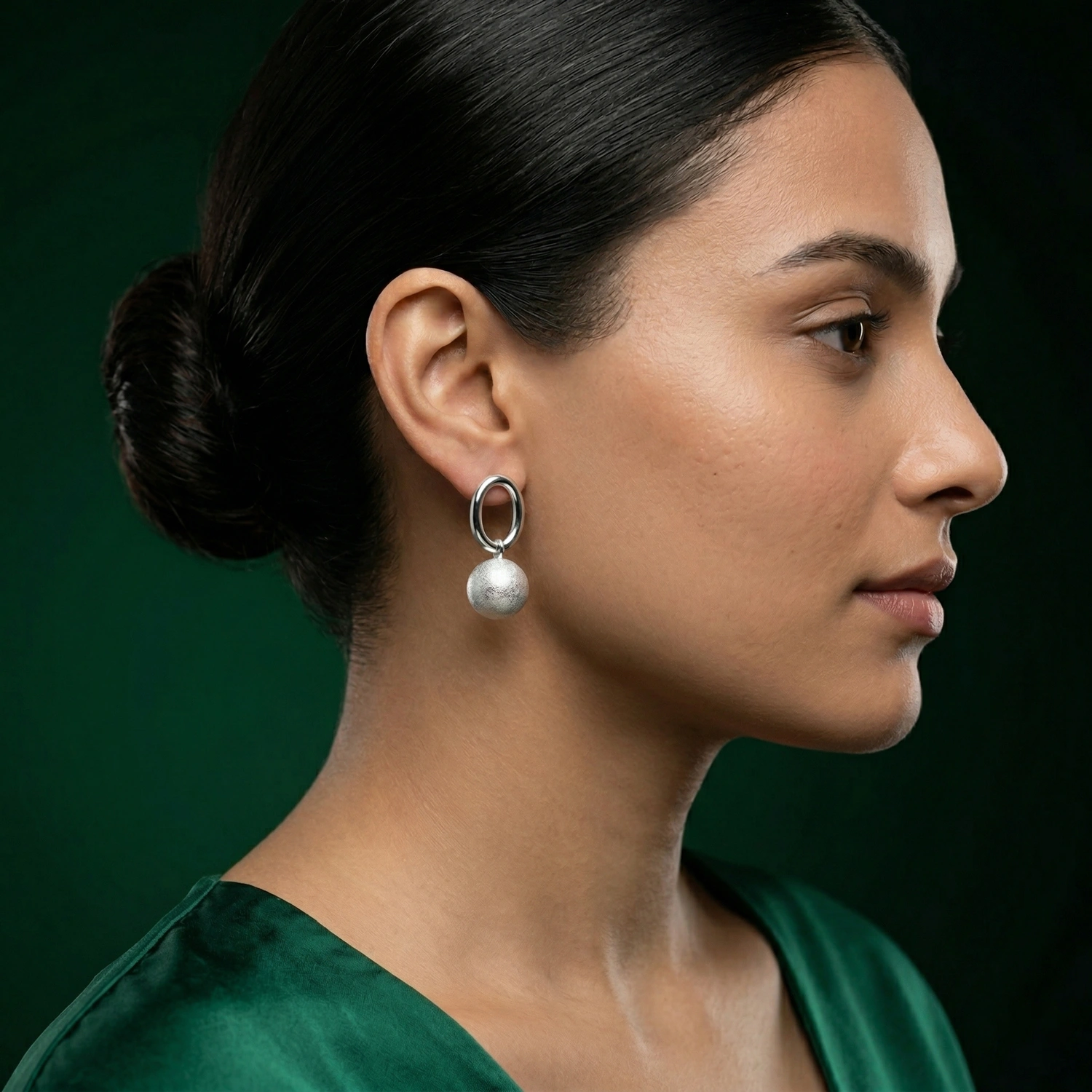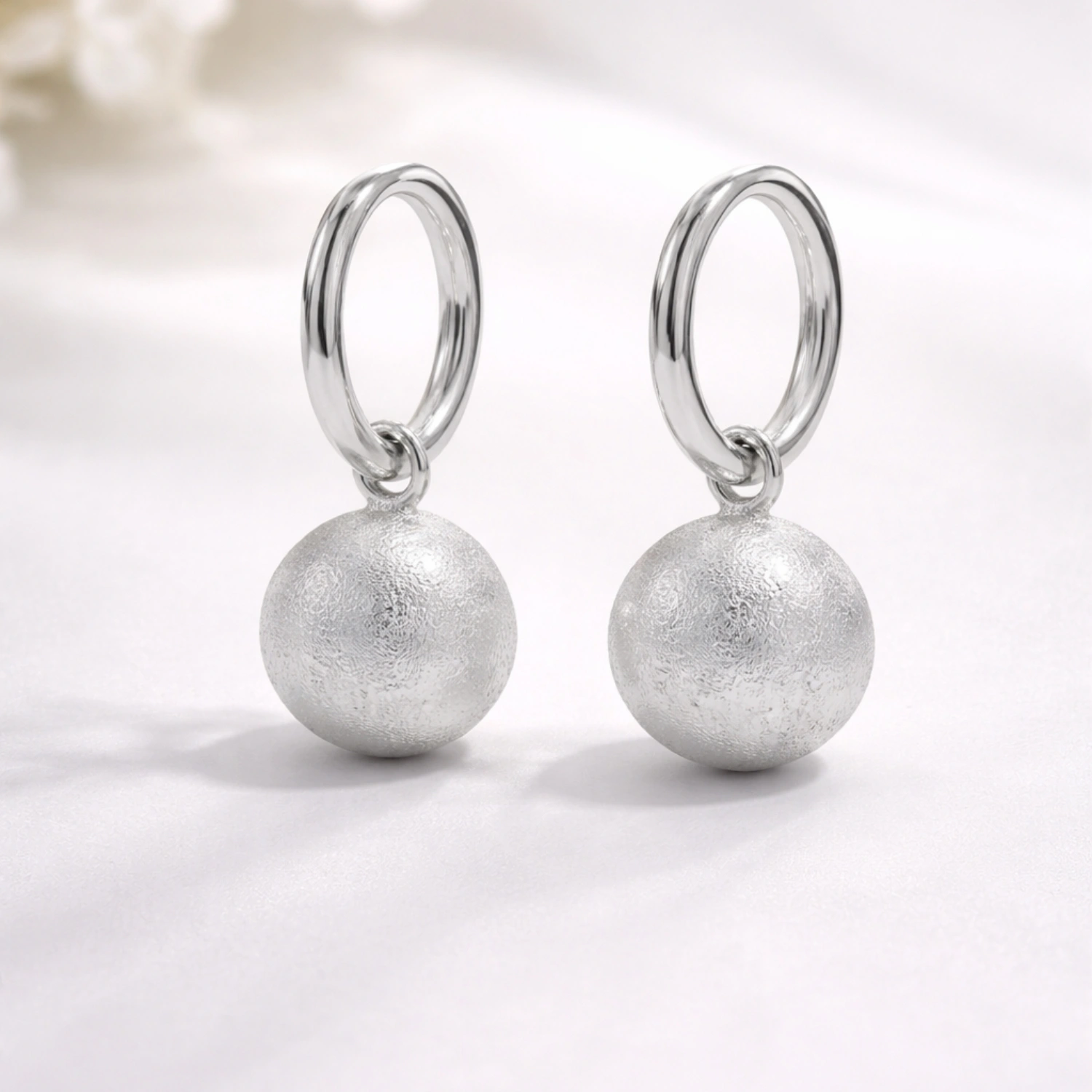 The Frosted Sphere Drop Earrings are elegant 925 sterling silver earrings featuring a sleek oval hoop paired with a textured, frosted metallic sphere.