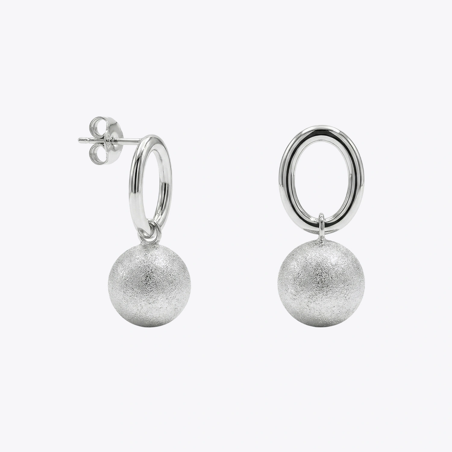 Elegant 925 silver earrings featuring a polished oval hoop suspended above a uniquely textured, frosted metallic sphere.