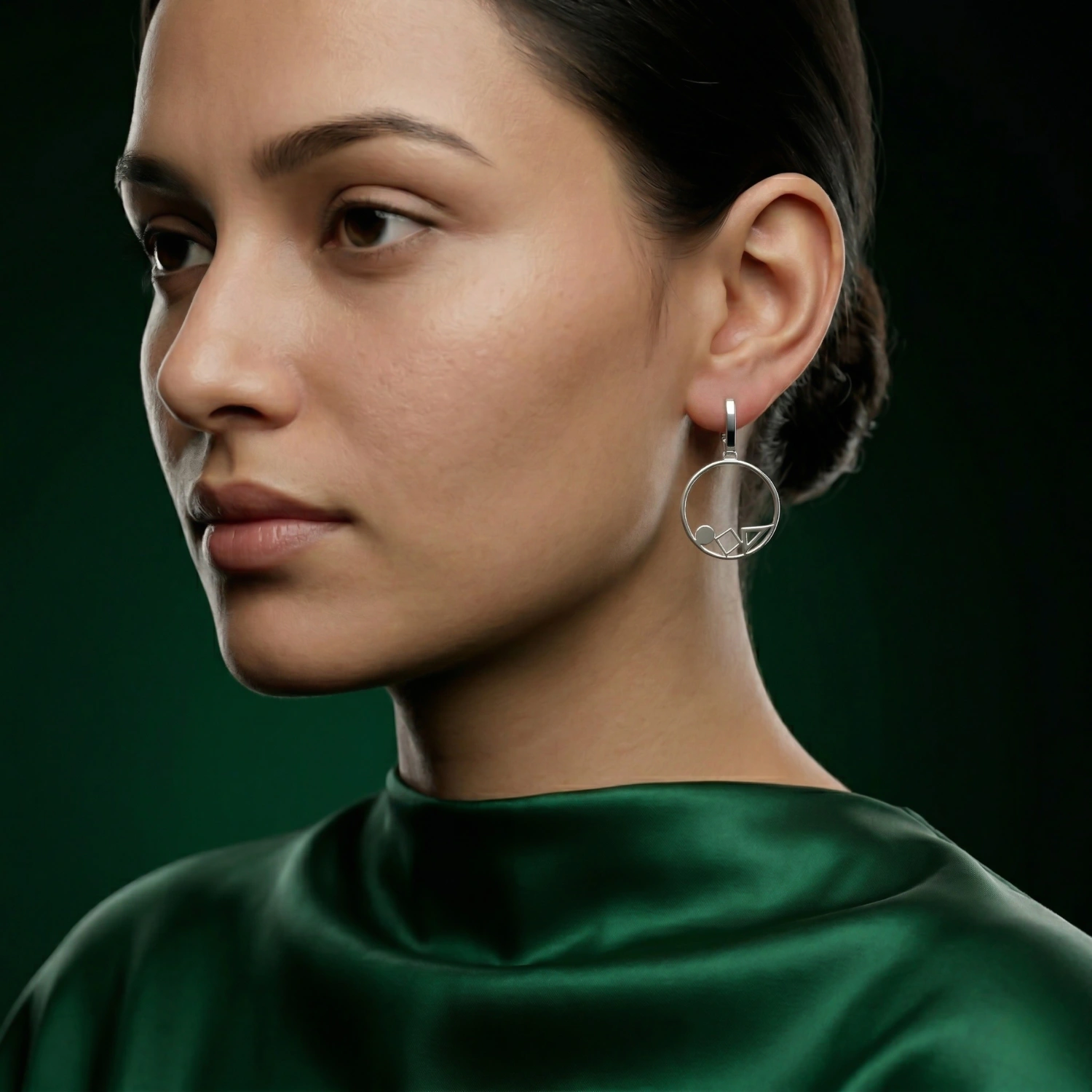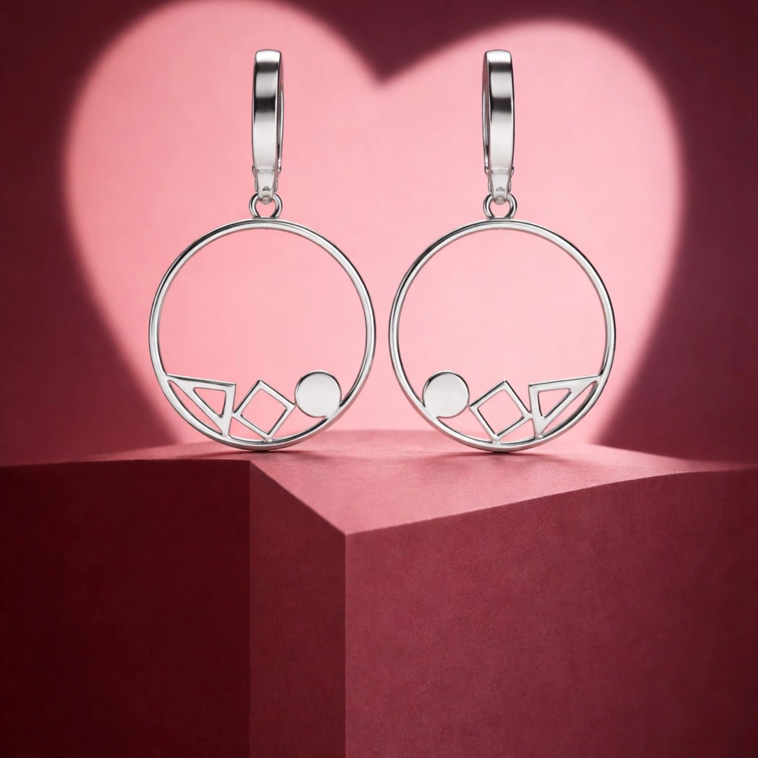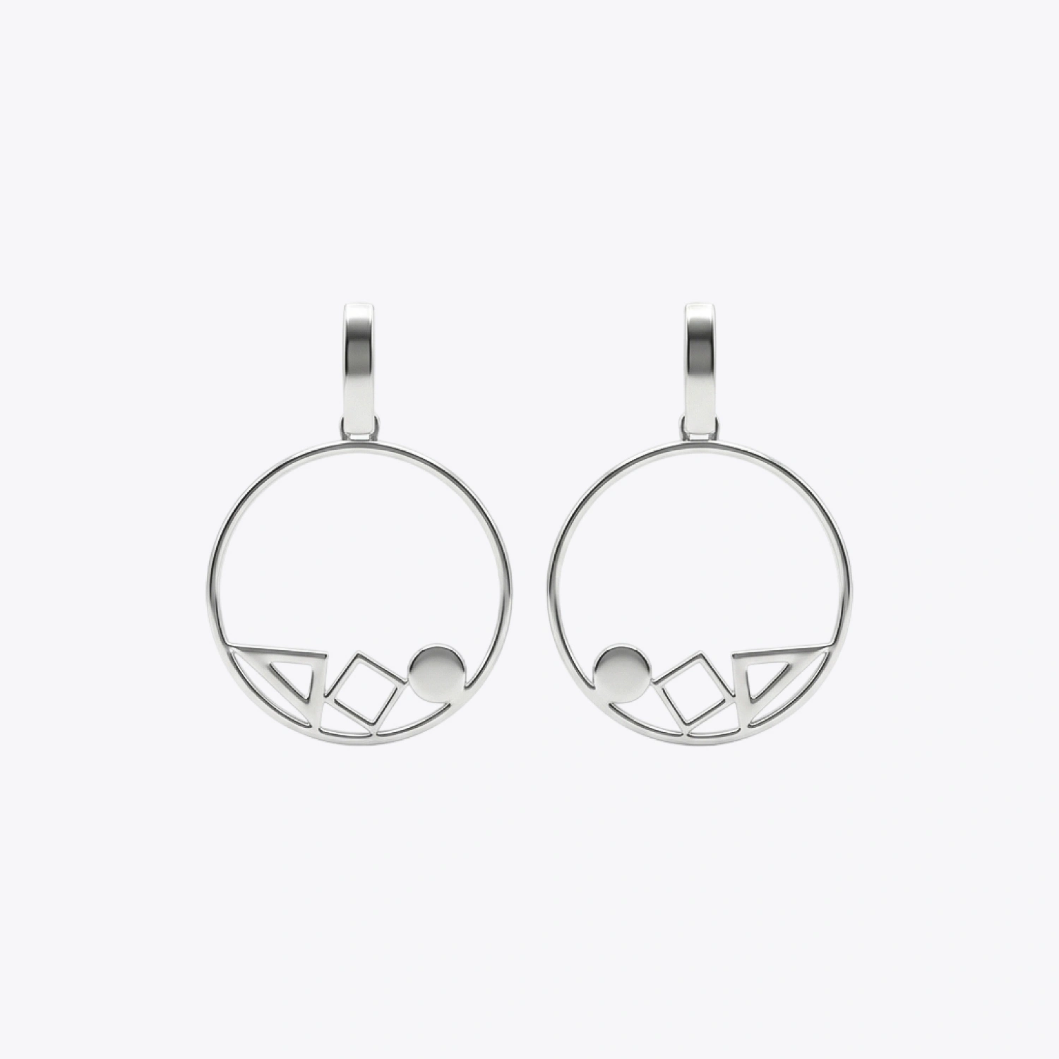 A contemporary take on classic hoops, featuring a unique arrangement of geometric shapes suspended within a high-polish silver circle.