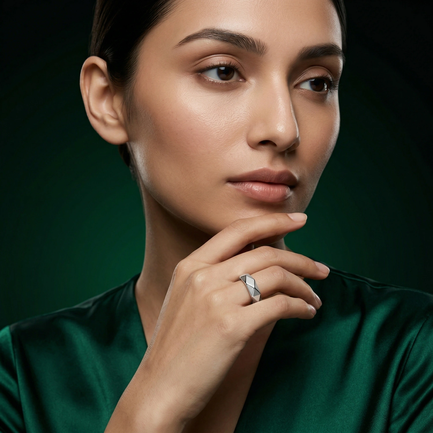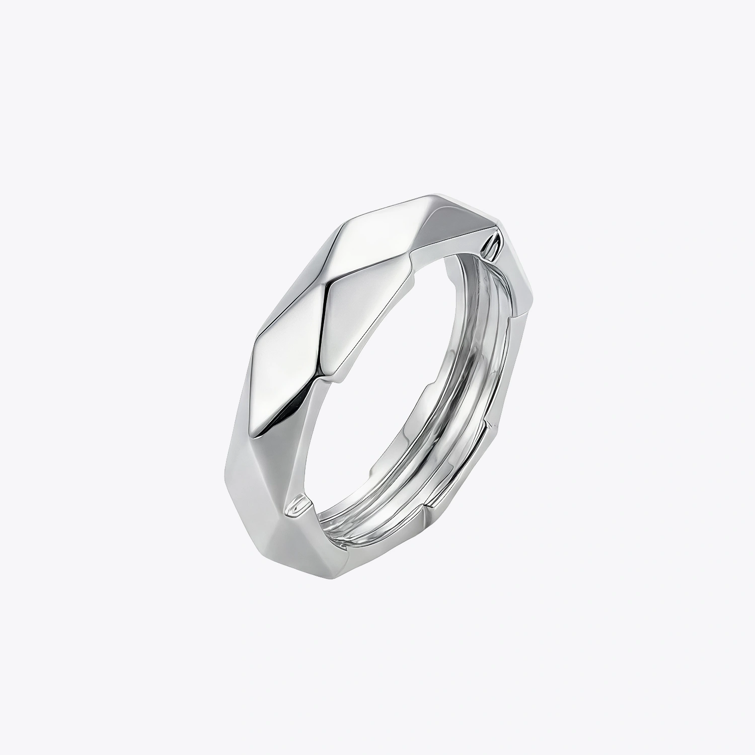 Geometric Prism Band Ring is a sleek 925 sterling silver band featuring a continuous multi-faceted pattern that creates a bold, modern textured look without the use of gemstones.