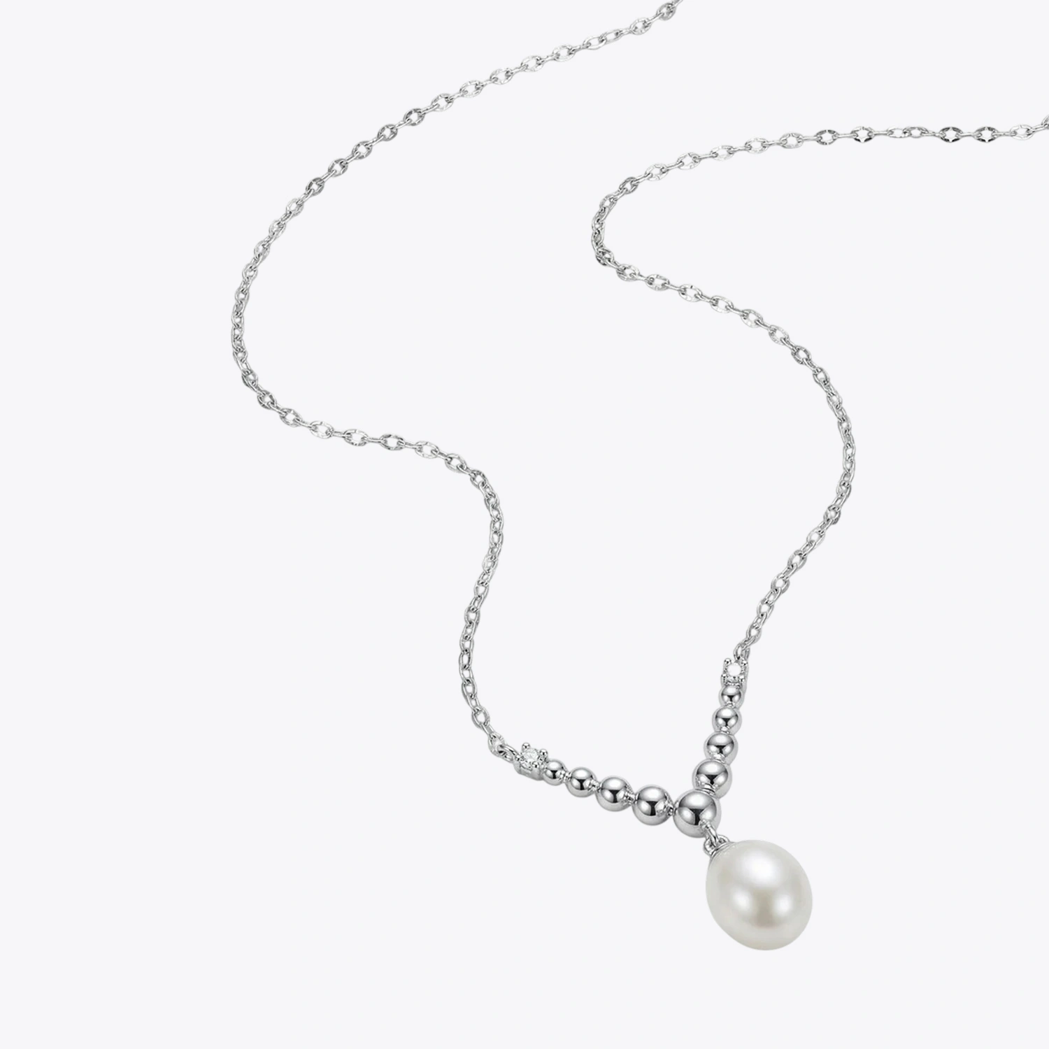 A sophisticated necklace featuring a lustrous pearl drop suspended from a graduating silver bead centerpiece.