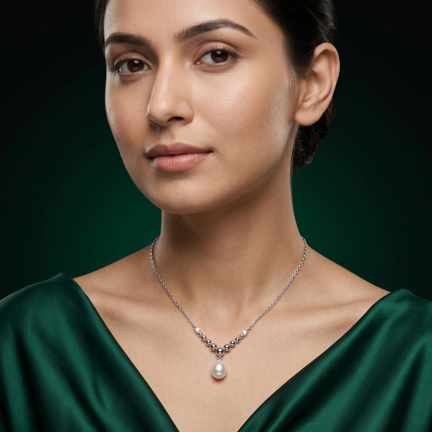 The Graceful Pearl & Silver Orb Drop Necklace is a sophisticated 925 sterling silver piece featuring a luminous pearl drop paired with polished silver spheres for a refined, modern look.