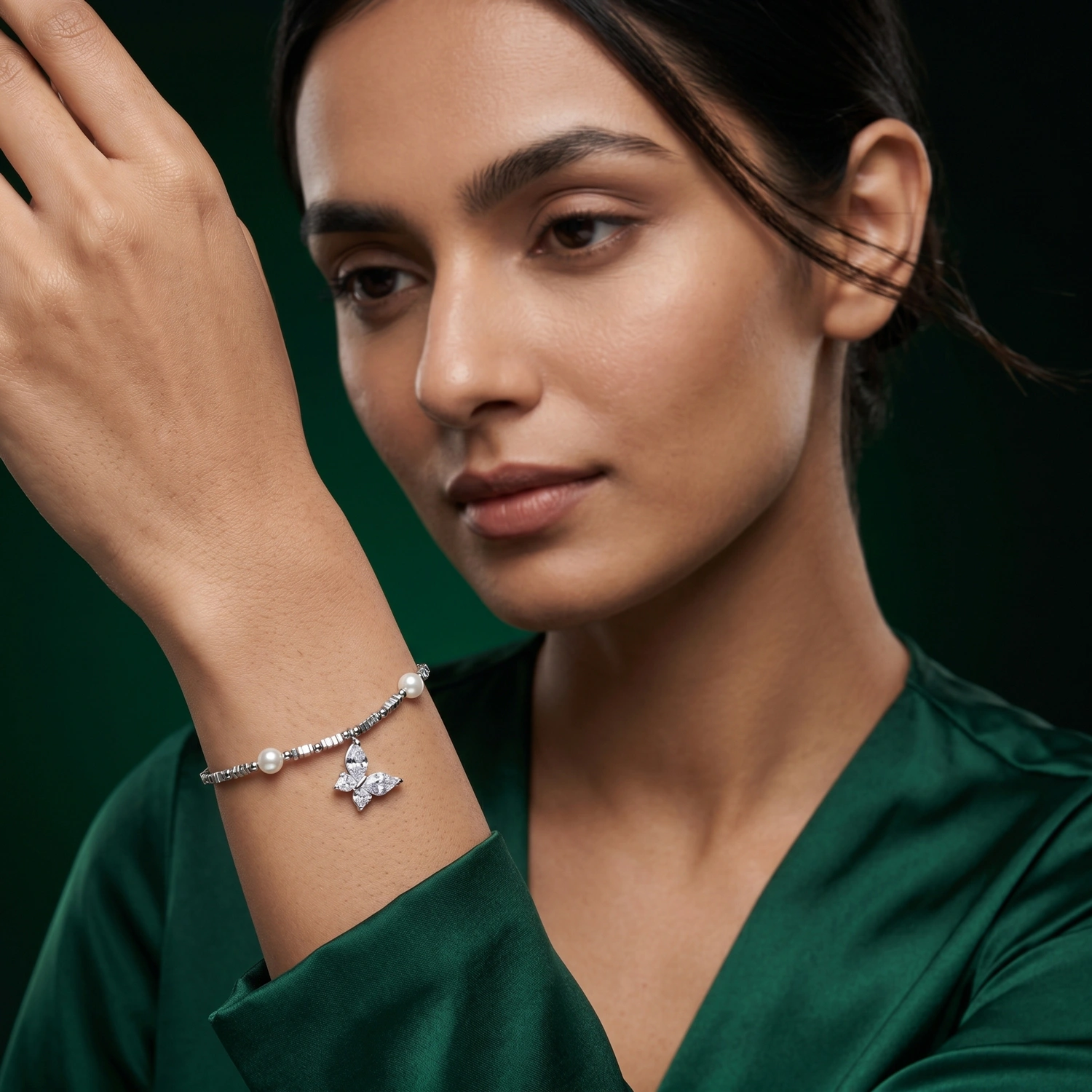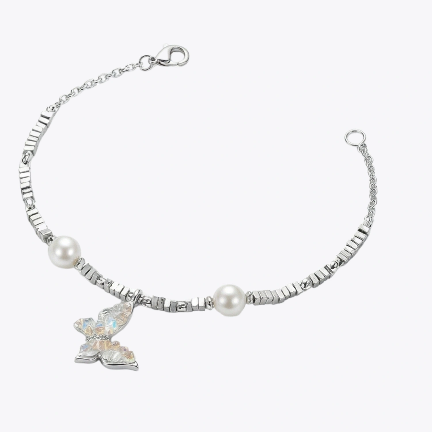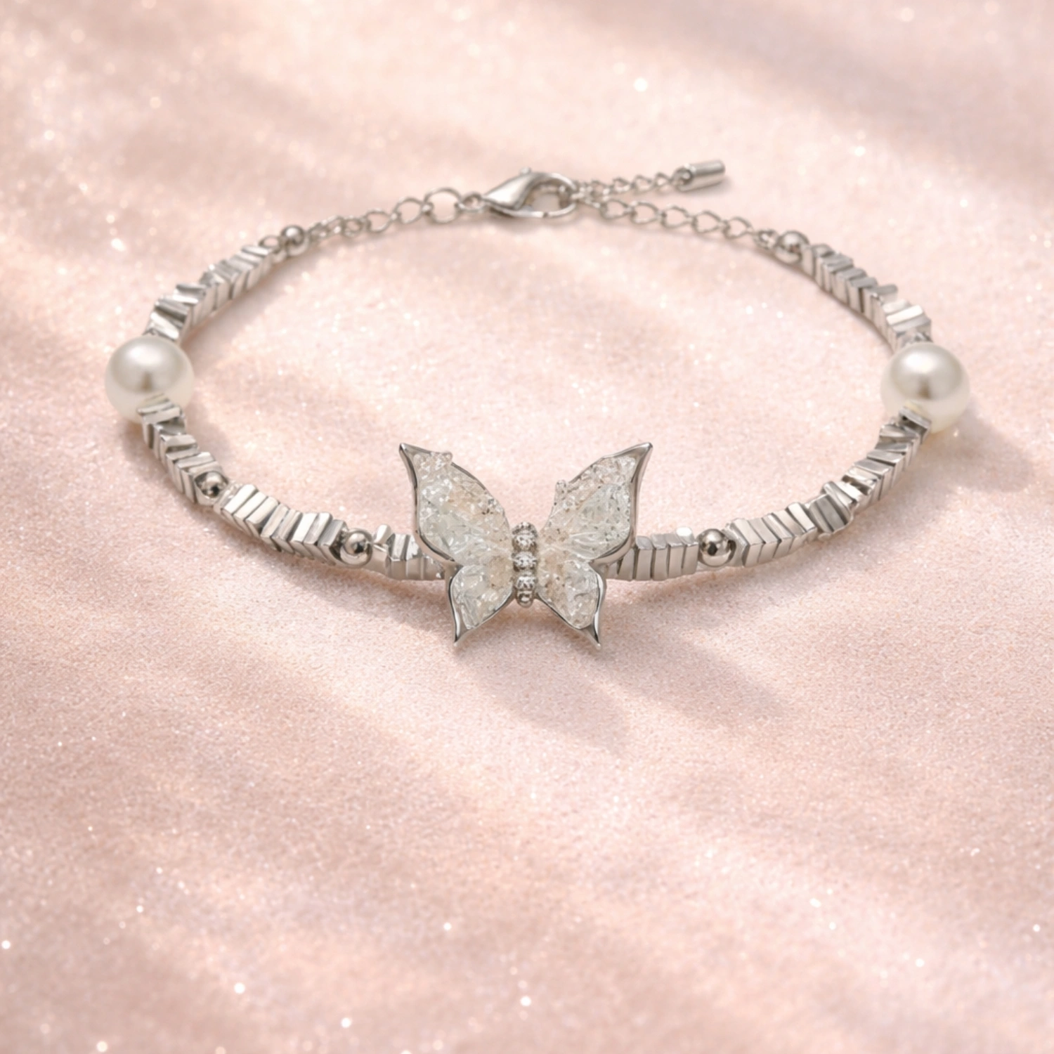 The Iridescent Butterfly & Pearl Bracelet pairs beautifully with elegant gowns, floral dresses, pastel outfits, or even minimal everyday wear. It can be styled as part of a full coordinated set for a glamorous occasion or worn alone to add a subtle touch of sparkle. Its butterfly and pearl combination makes it especially suitable for romantic, feminine, and nature-inspired styling.