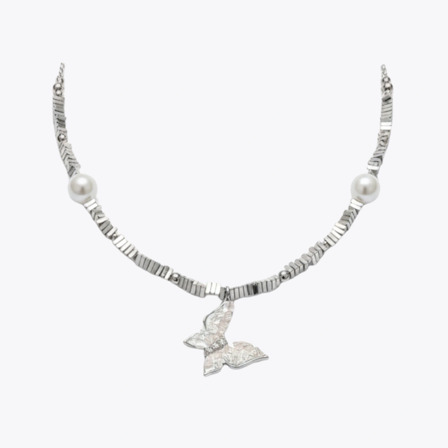 Handcrafted in premium 925 sterling silver, the design showcases intricately textured butterfly wings that add depth and artistic detail, while the high-luster pearls bring timeless sophistication. The modern beaded chain structure enhances the contemporary appeal, creating a balanced look of softness, sparkle, and refined luxury. Finished in high-polish sterling silver, every piece shines with effortless brilliance.