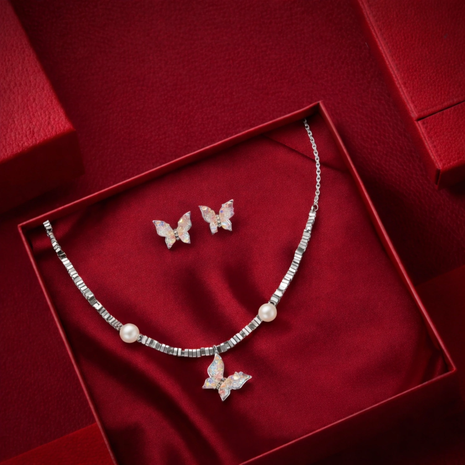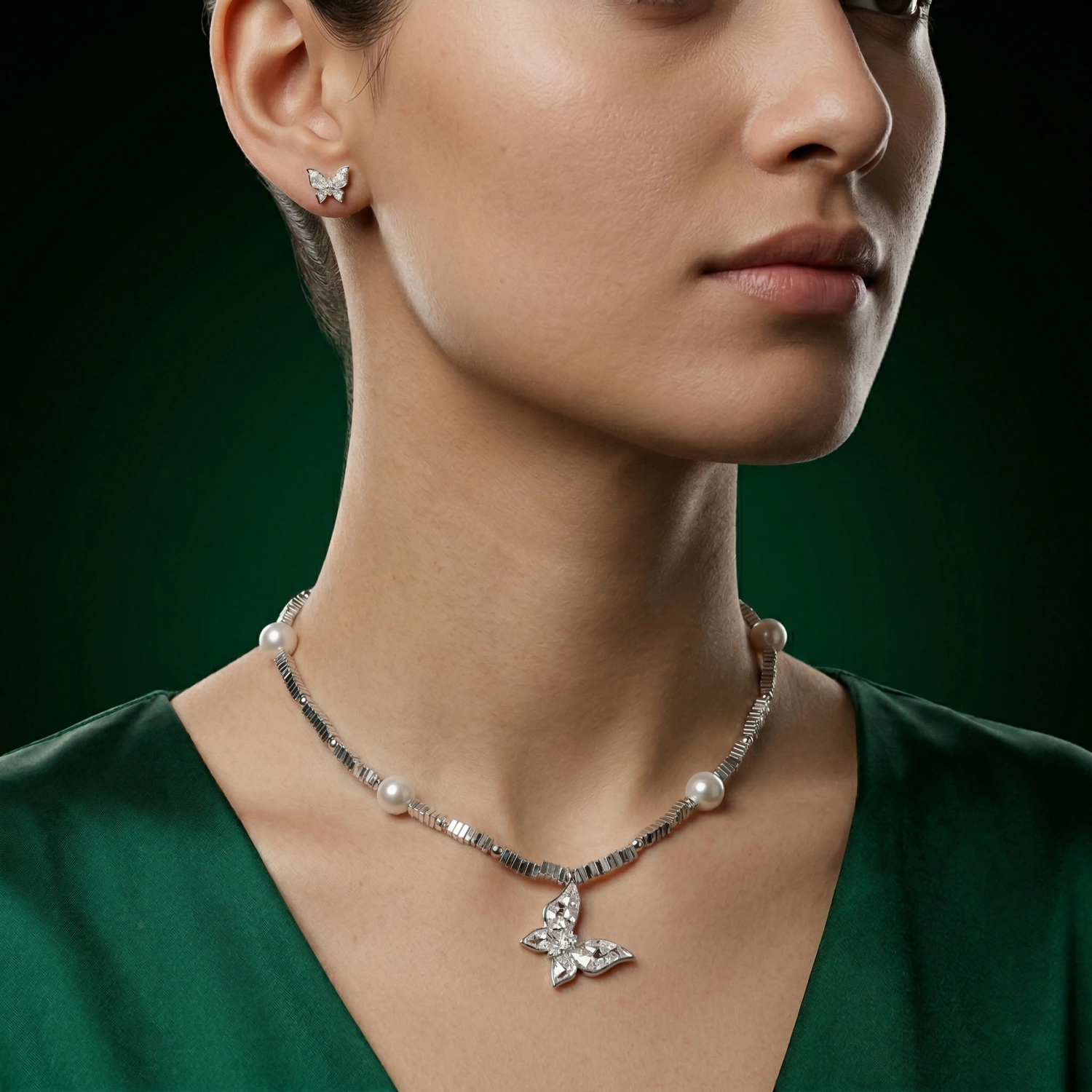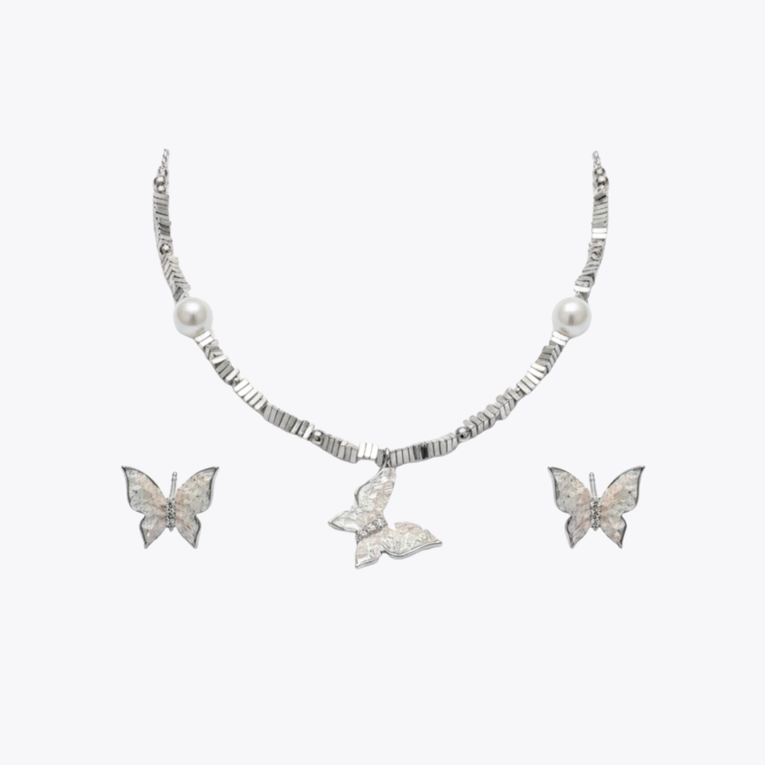 This elegant ensemble features beautifully textured butterfly wings crafted in 925 sterling silver, paired with refined geometric accents and luminous pearl highlights. The intricate detailing of the butterfly motifs creates a nature-inspired luxury feel, while the pearls add timeless softness and sophistication.