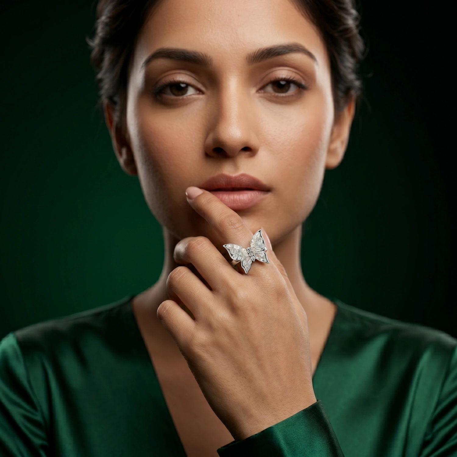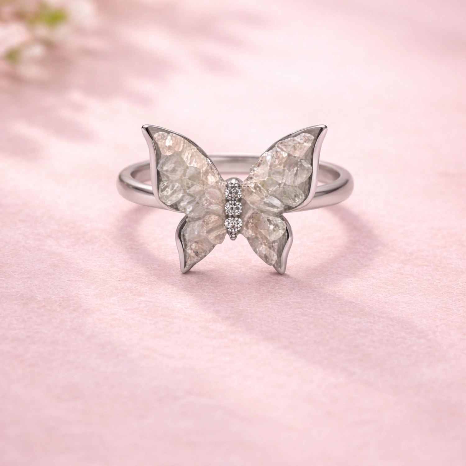 Handcrafted in premium 925 sterling silver, the ring showcases beautifully detailed textured butterfly wings that create depth, dimension, and delicate movement within the design. High-luster pearl accents add a soft luminous glow, balancing the geometric silver structure with classic elegance. The polished silver finish enhances every intricate detail, giving the ring a refined brilliance that makes it perfect for both occasion wear and elevated daily styling.