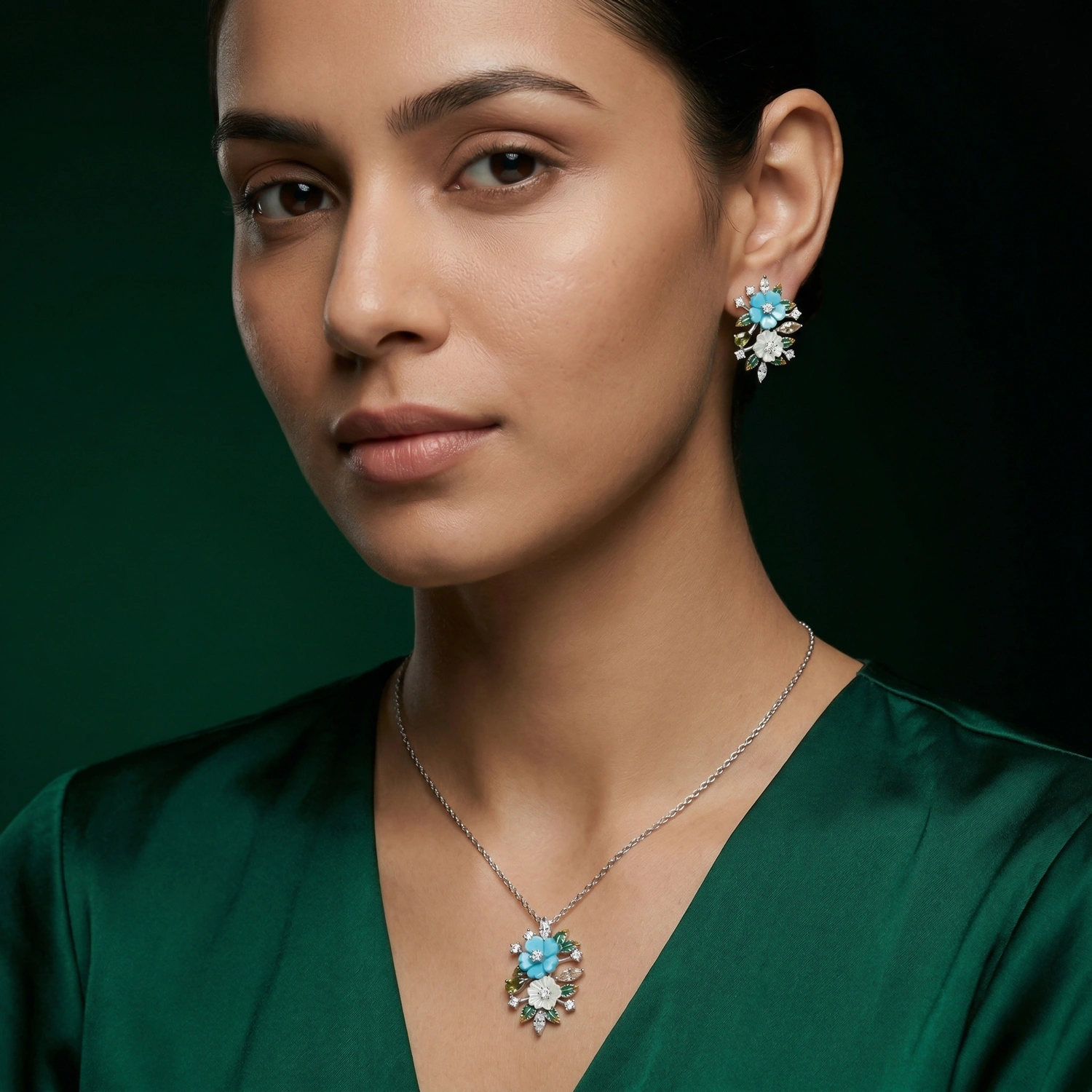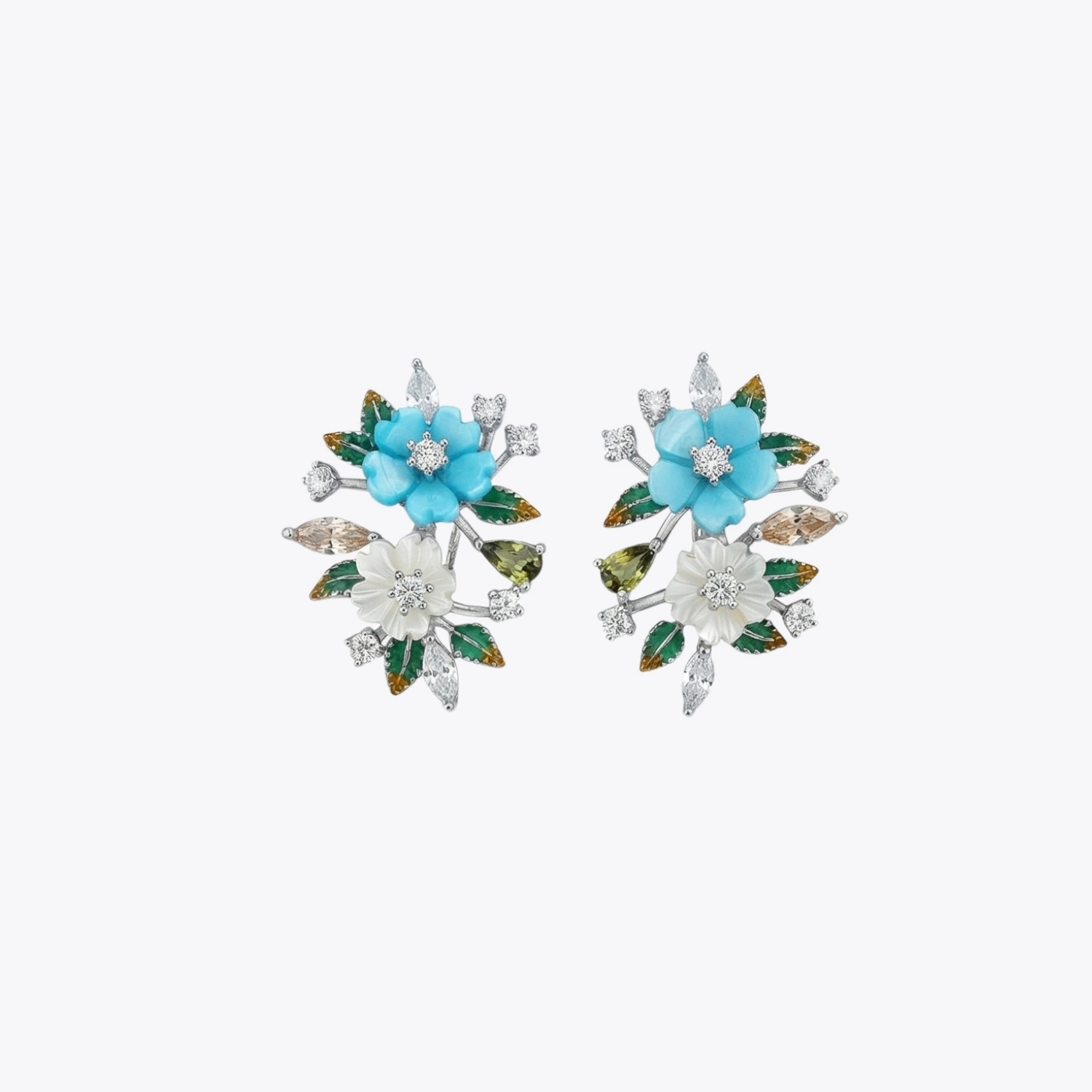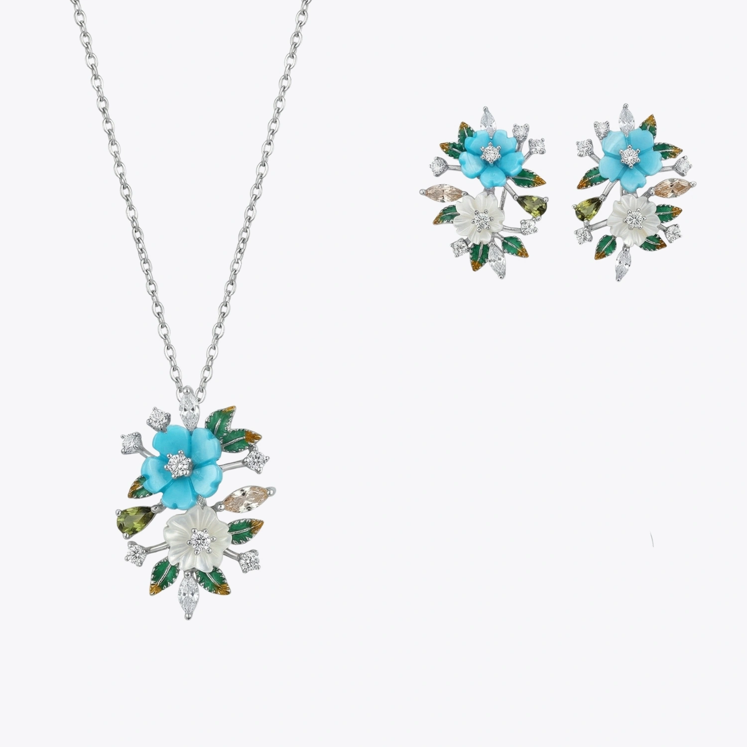 This exquisite set features hand-carved turquoise and white shell flower petals gracefully arranged on a delicate silver branch. Marquise-cut peridot stones and warm amber-toned gems add natural depth and vibrant contrast, creating a luxurious botanical statement.
