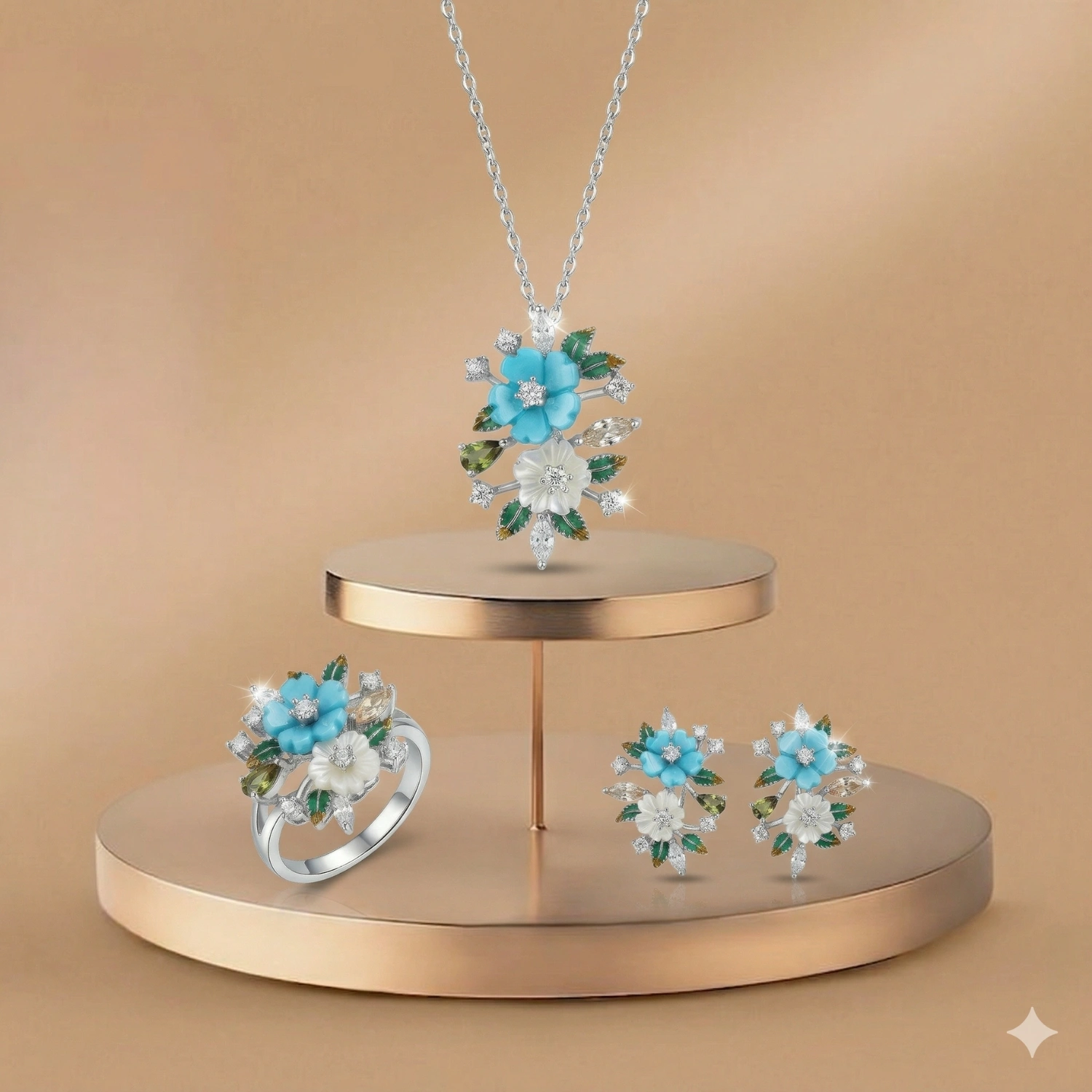 The Mediterranean Bloom Garden Set is an artisanal 925 sterling silver jewelry collection inspired by the vibrant beauty of coastal botanicals and sunlit summer gardens. Featuring turquoise and white shell flowers accented with warm earth-toned gemstones, this set captures a refined bohemian luxury aesthetic with intricate fine-jewelry craftsmanship.