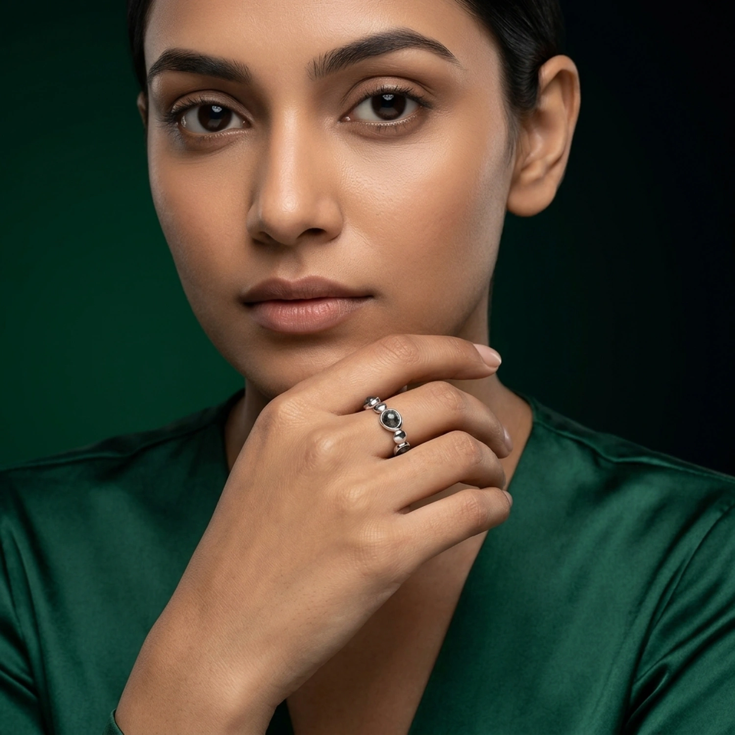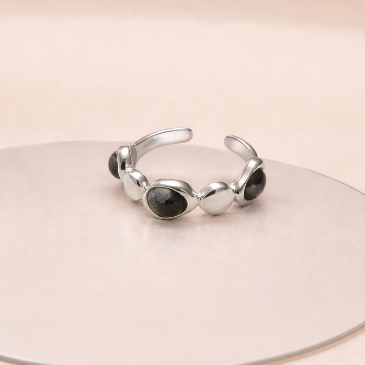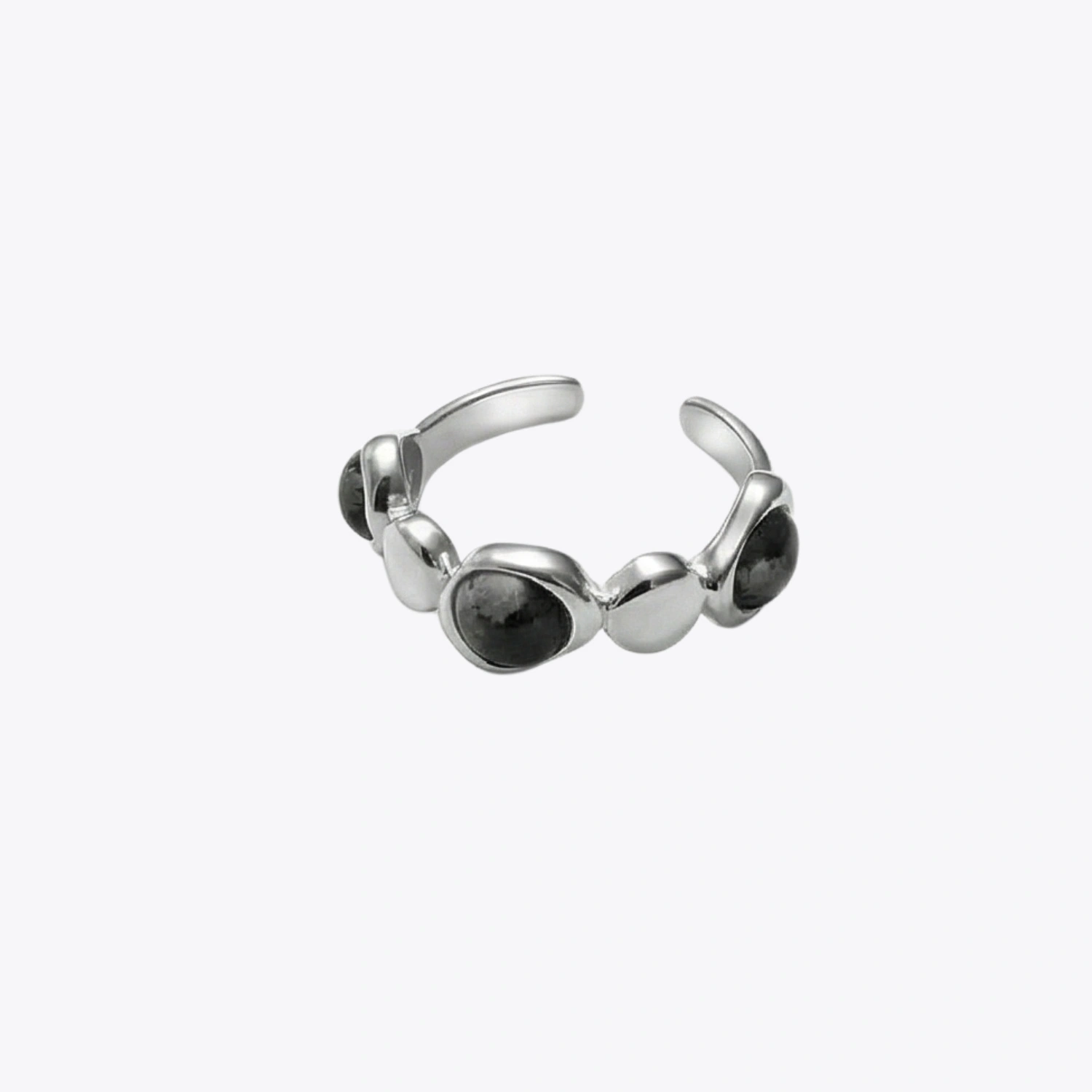 The design showcases a beautifully uneven pebble-textured silhouette, combining polished silver discs with bezel-set circular dark stones for an organic handcrafted finish. The rich stone tones create a moody, mysterious contrast against the bright sterling silver, making the ring both expressive and versatile. Crafted in premium 925 sterling silver with a high-polish finish, this adjustable ring offers lasting shine, comfort, and a bold artistic presence.