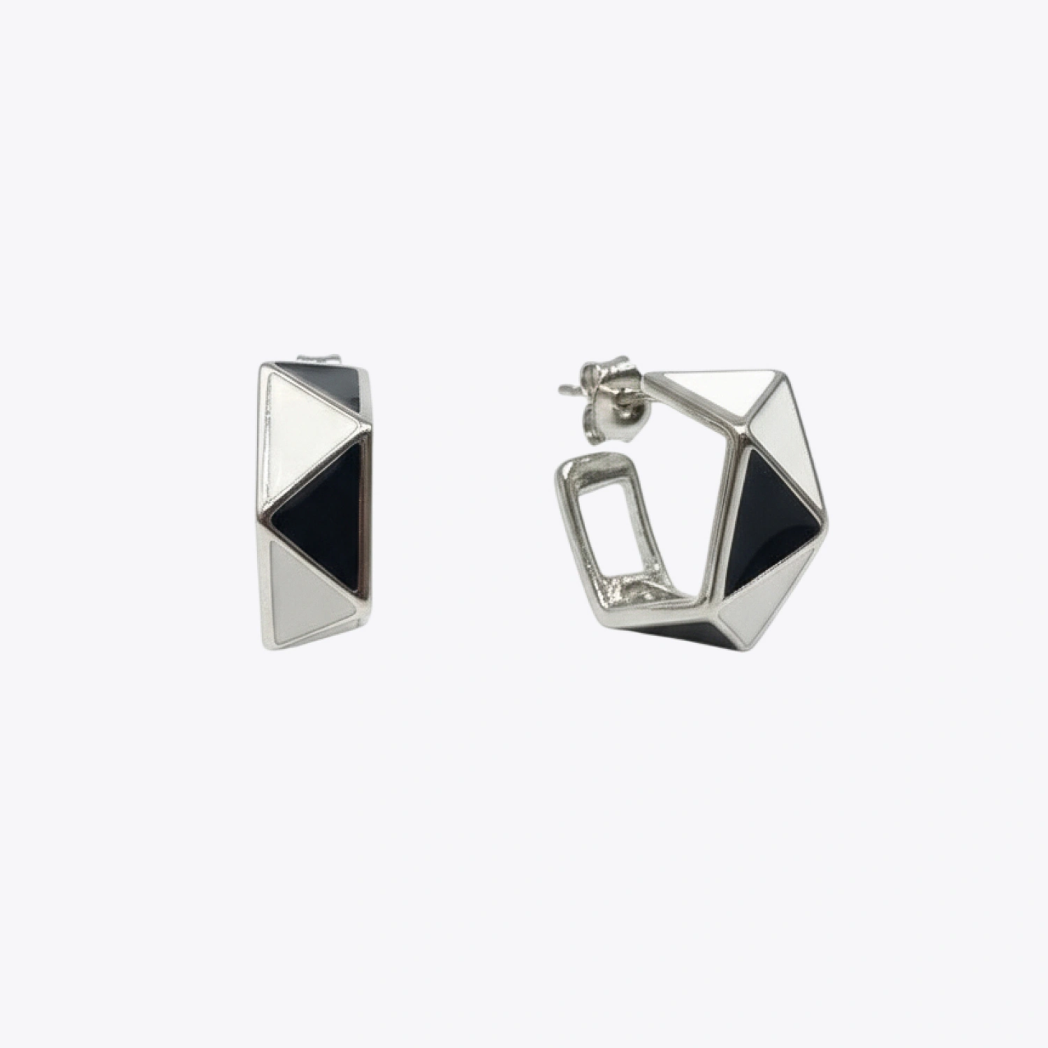 The Monochrome Geometric Prism Hoop Earrings are modern 925 sterling silver hoops featuring a bold angular silhouette with striking black and white enamel accents.