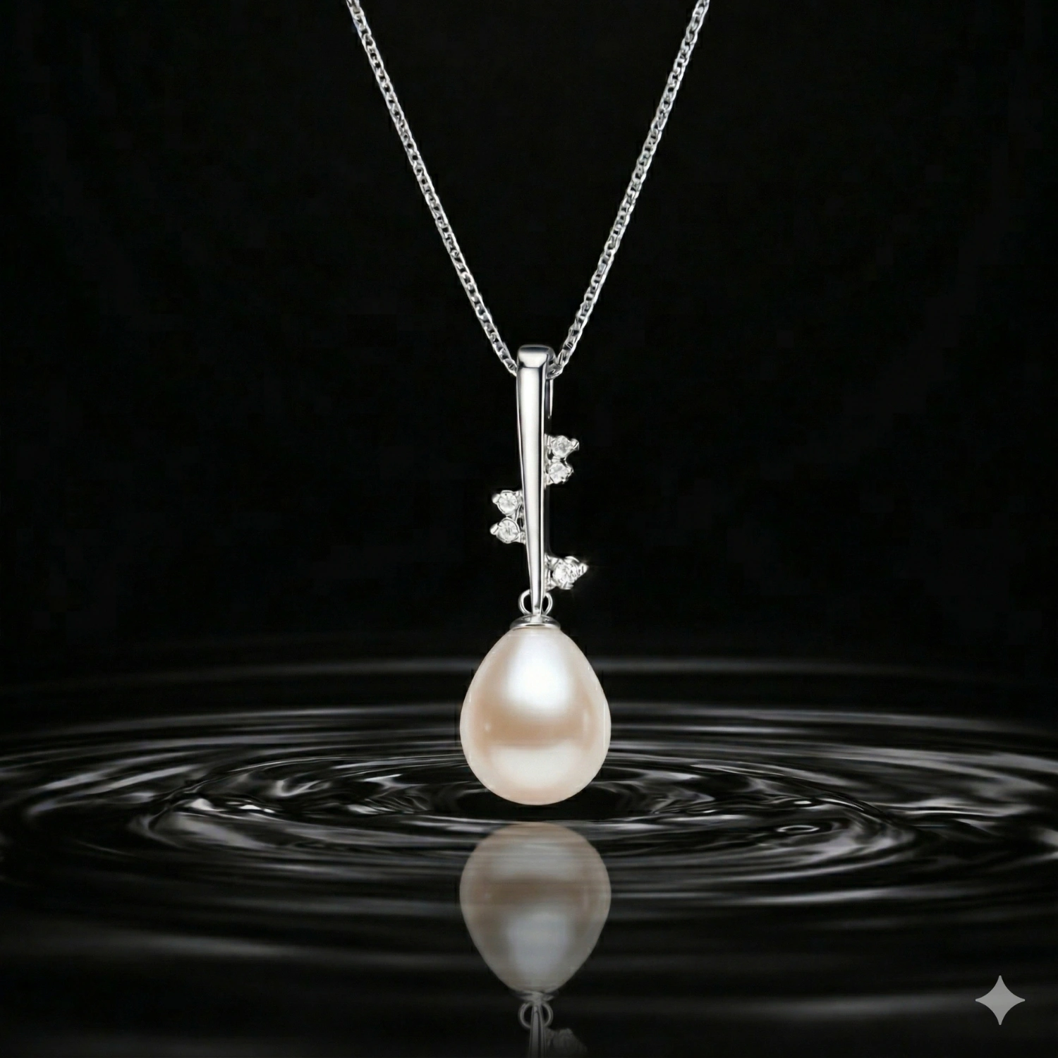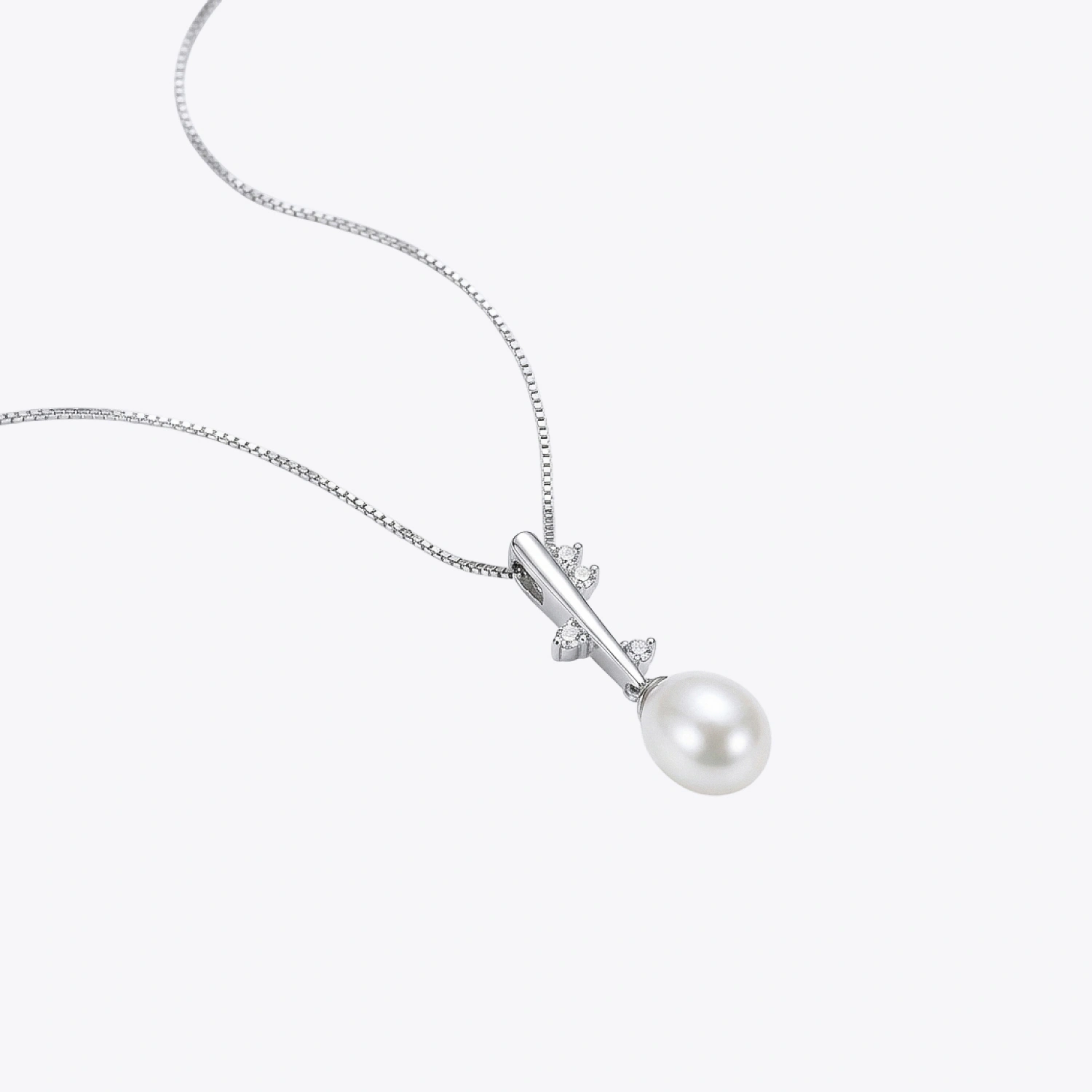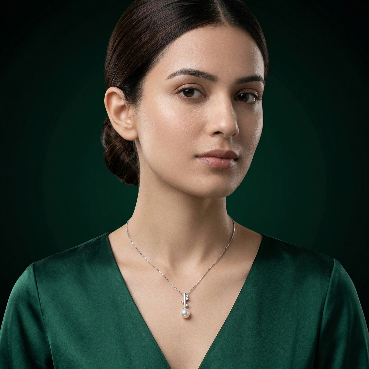 A timeless 925 silver necklace featuring a sleek vertical pendant adorned with sparkling accents and a luminous freshwater-style pearl.
