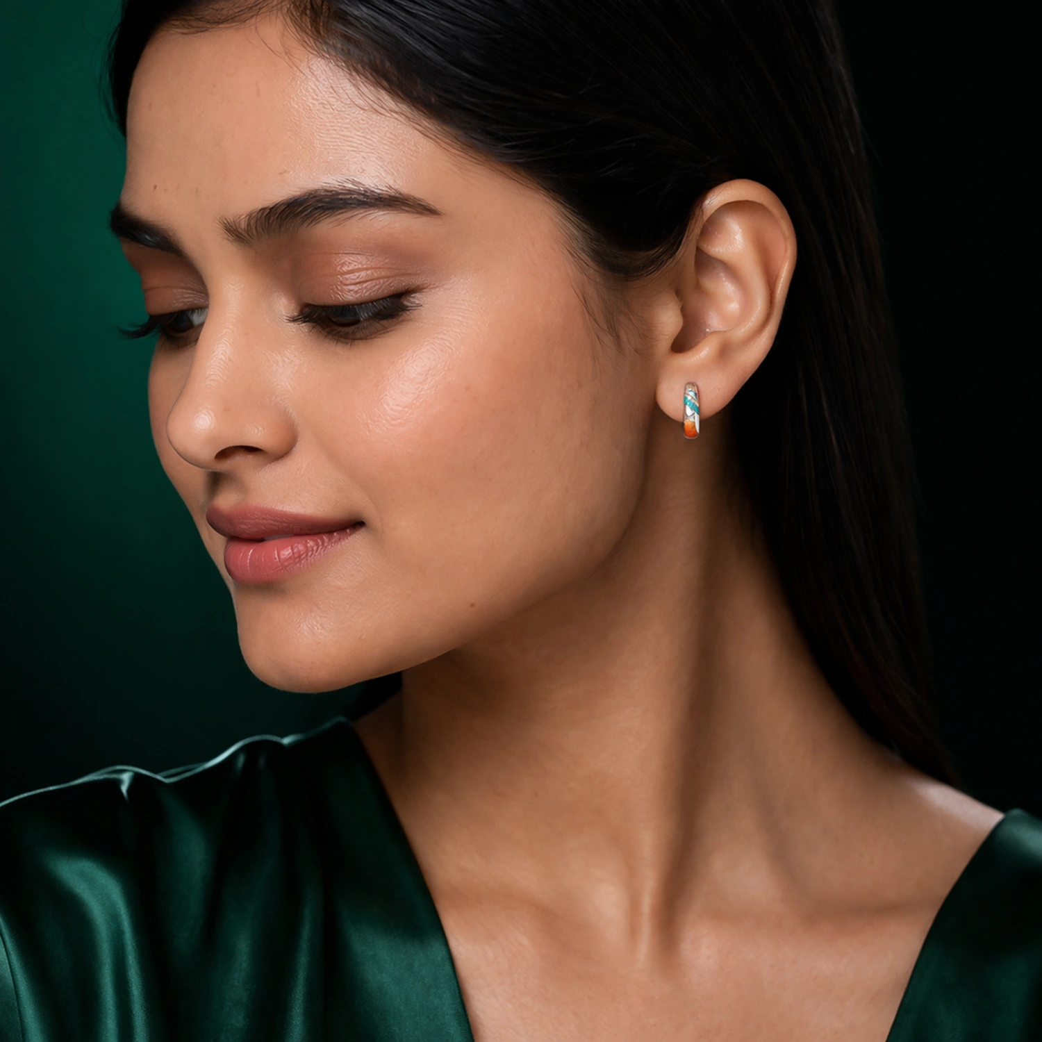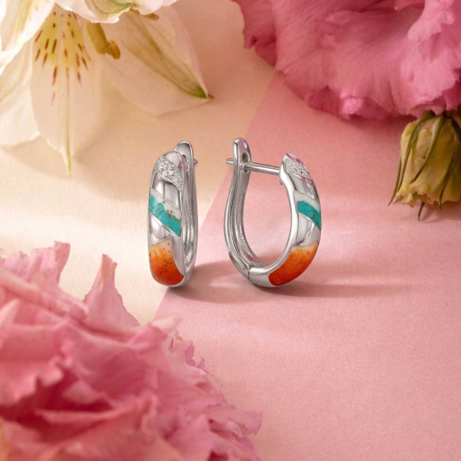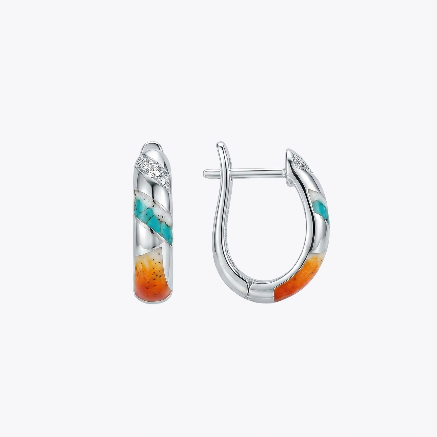 Elegant 925 silver J-hoop earrings featuring a colorful mosaic of turquoise and warm-toned stone inlays accented by shimmering crystals.