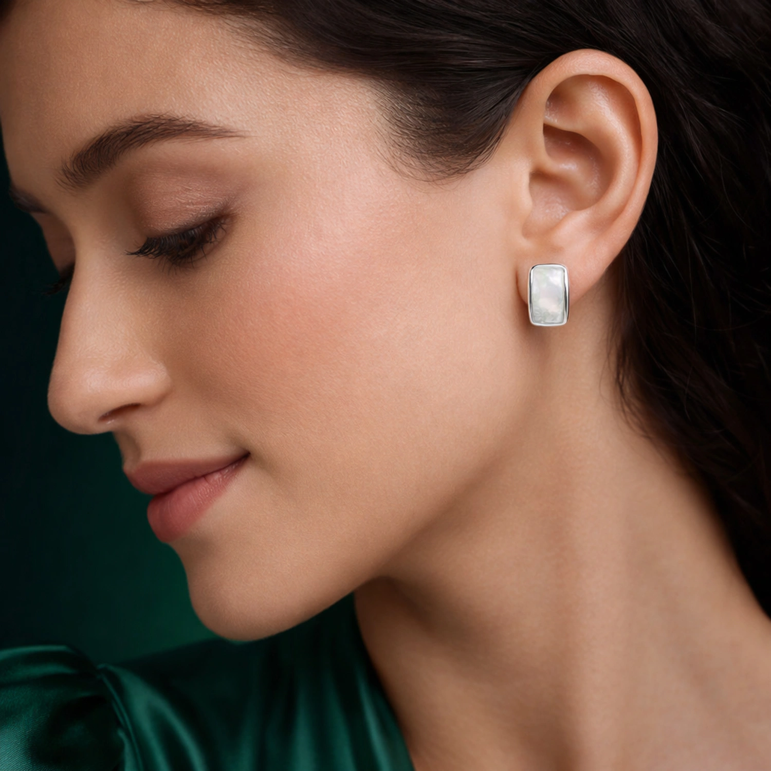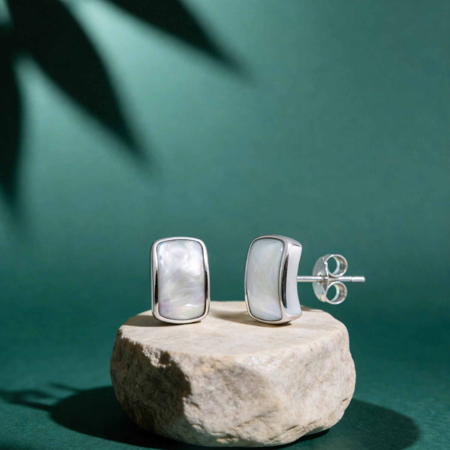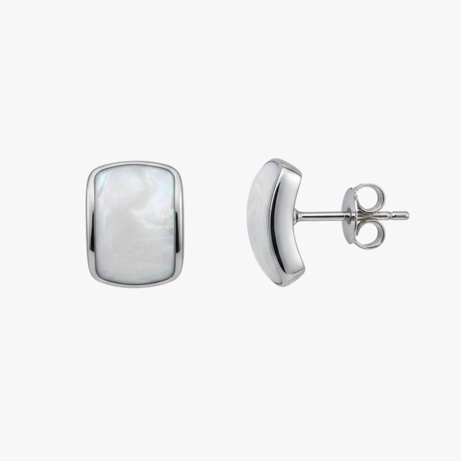 Elegant 925 silver studs featuring iridescent Mother of Pearl in a modern, curved cushion setting.