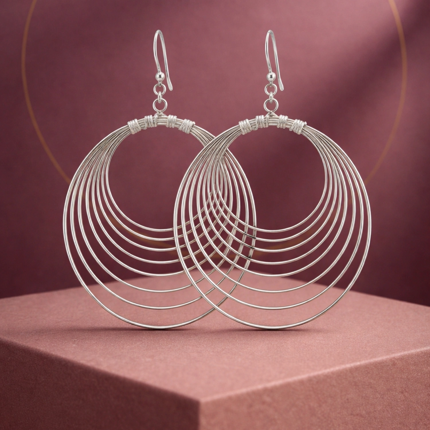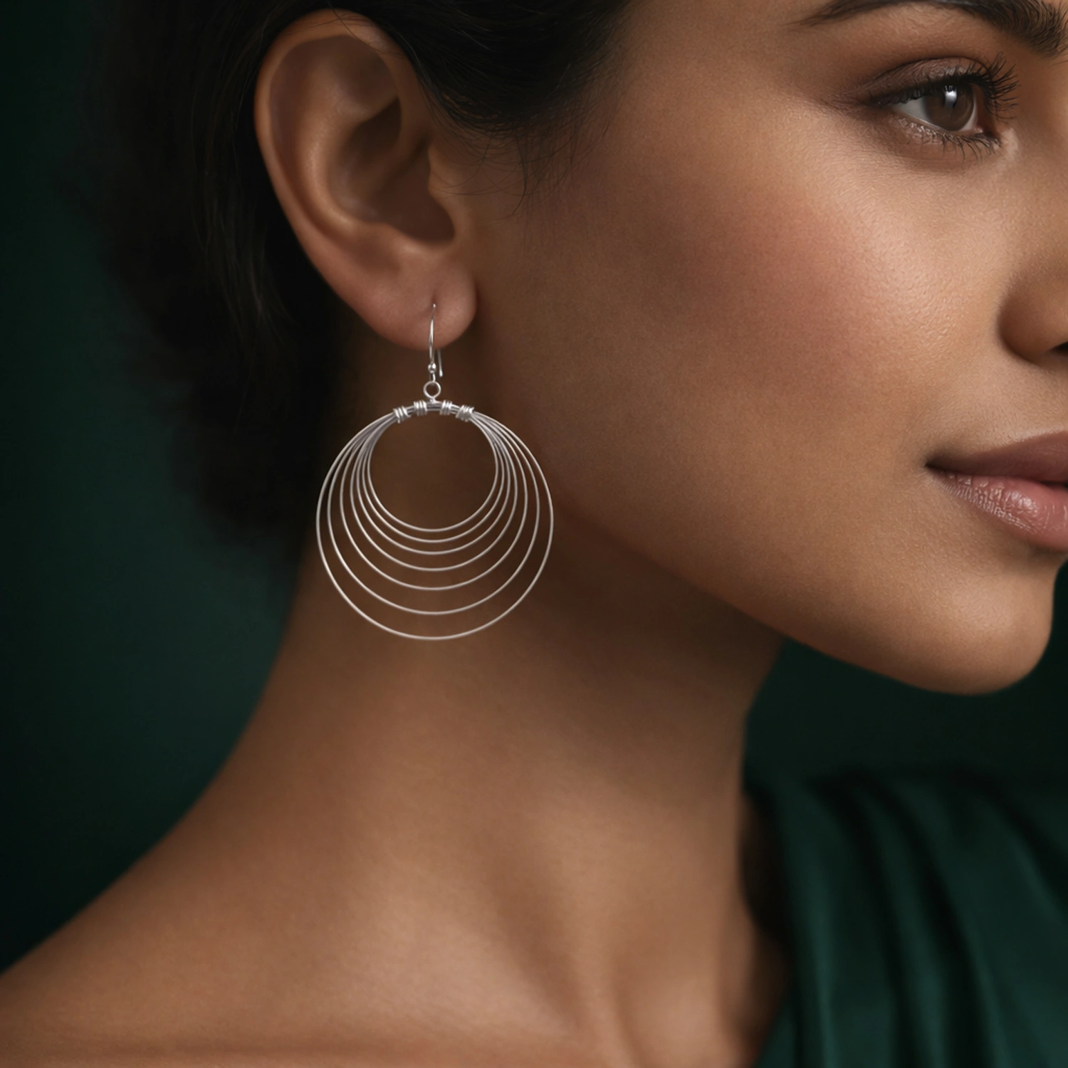The Orbiting Echo Multi-Hoop Earrings are bold 925 sterling silver statement earrings featuring layered concentric hoops for a dynamic, eye-catching look.