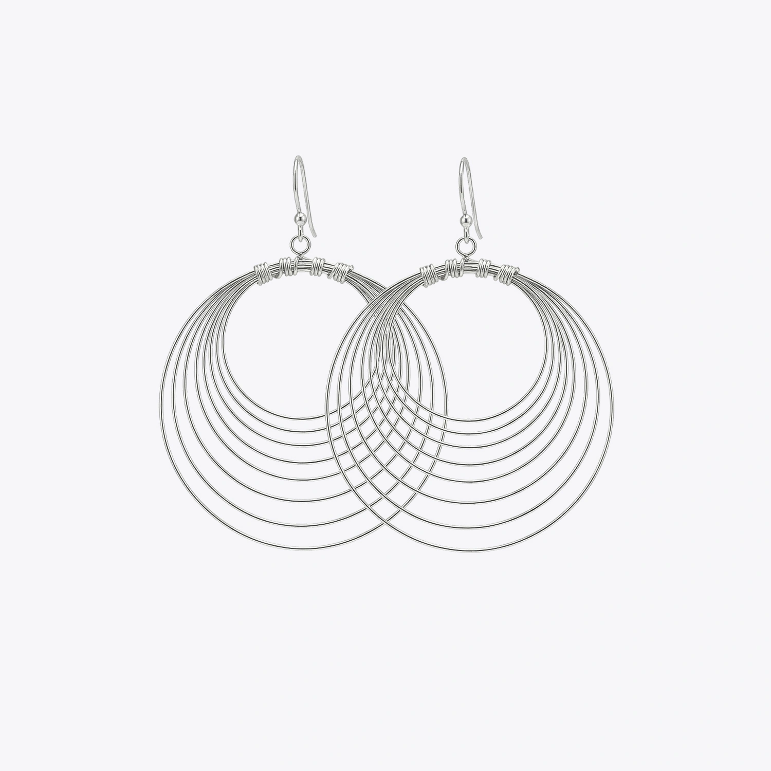 A stunning pair of statement earrings featuring concentric silver circles that create a dynamic, layered look.