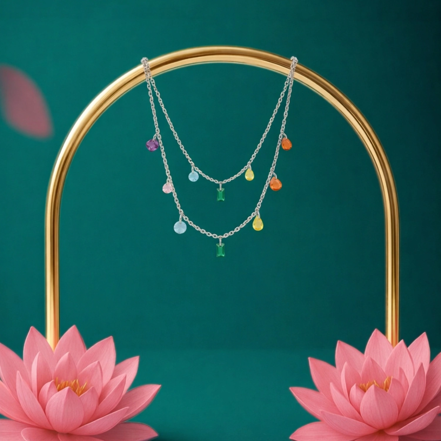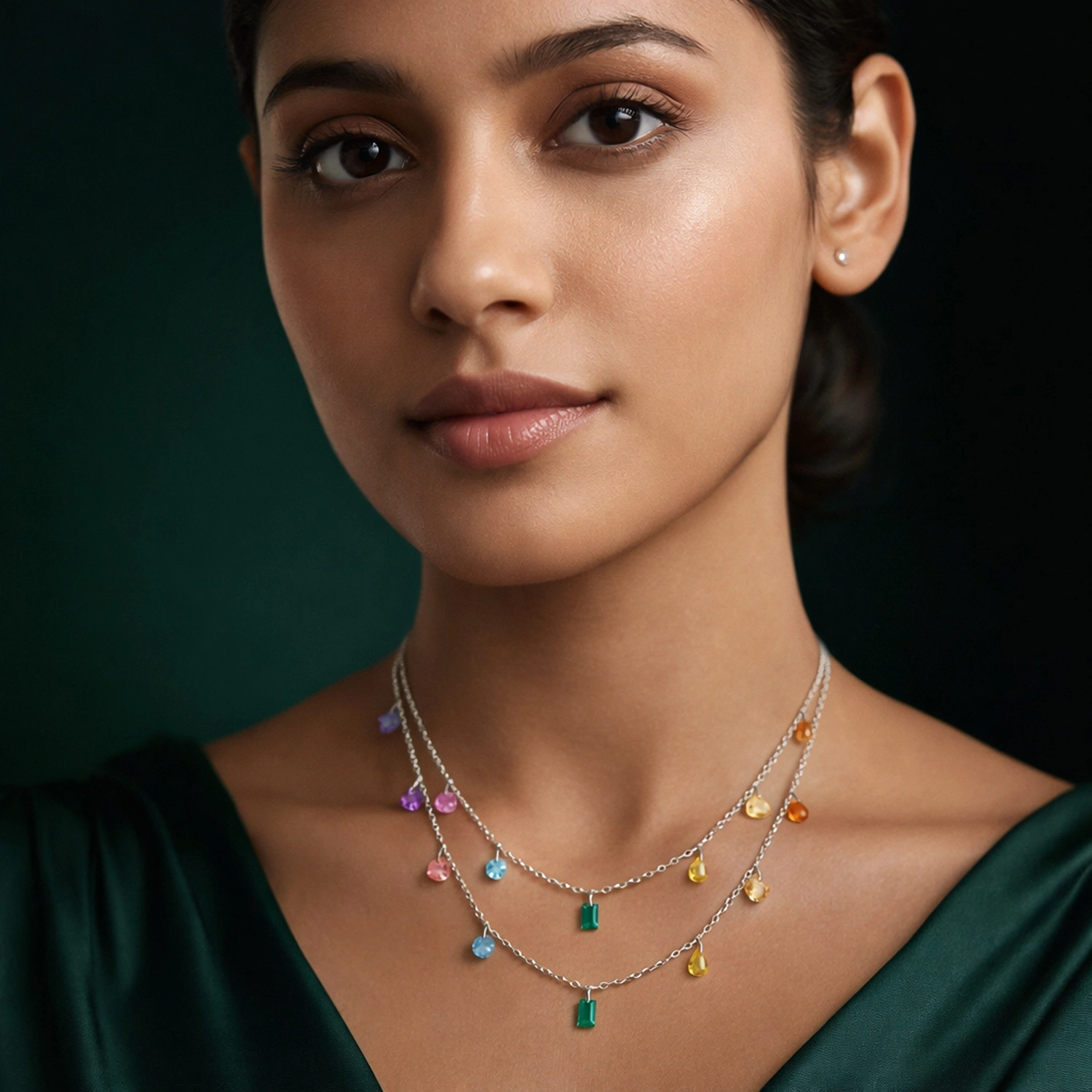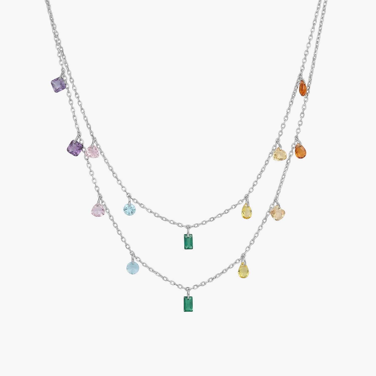 The Prism Cascade Layered Necklace is a vibrant 925 sterling silver double-layered necklace featuring a stunning mix of colorful, multi-shaped gemstones.