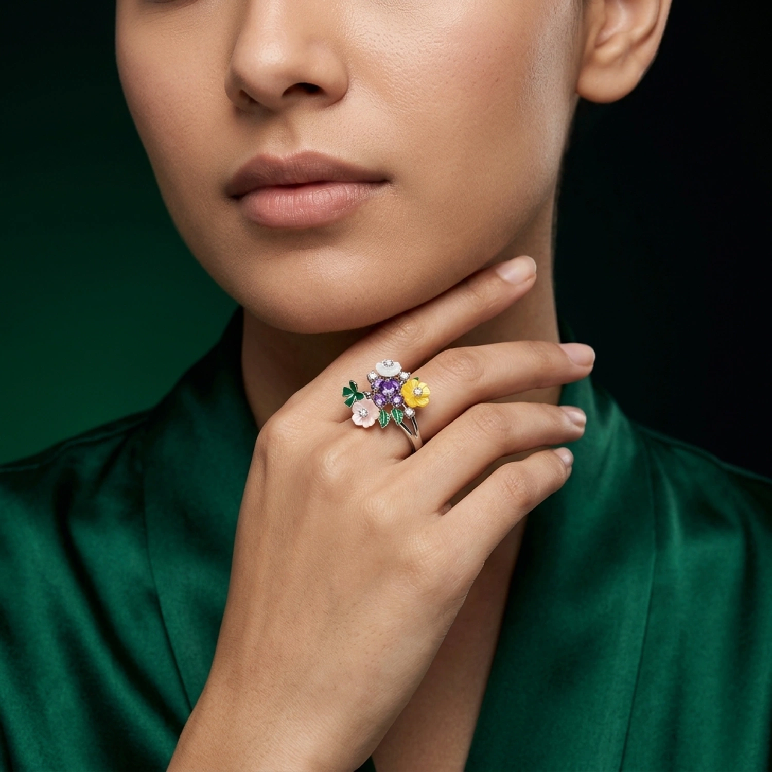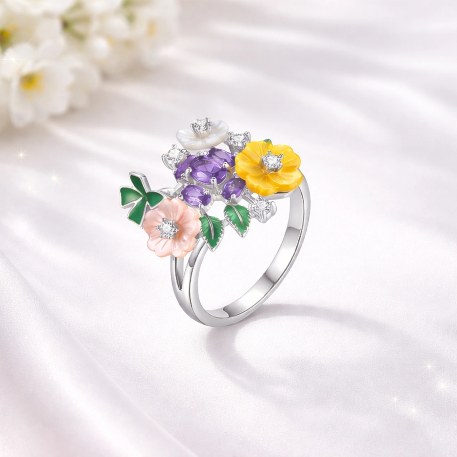 Wear this ring with a simple white sundress, pastel-toned outfit, floral blouse, silk dress, or neutral daytime styling to let the colorful garden theme truly pop. It pairs beautifully with slim silver bands or delicate floral studs.