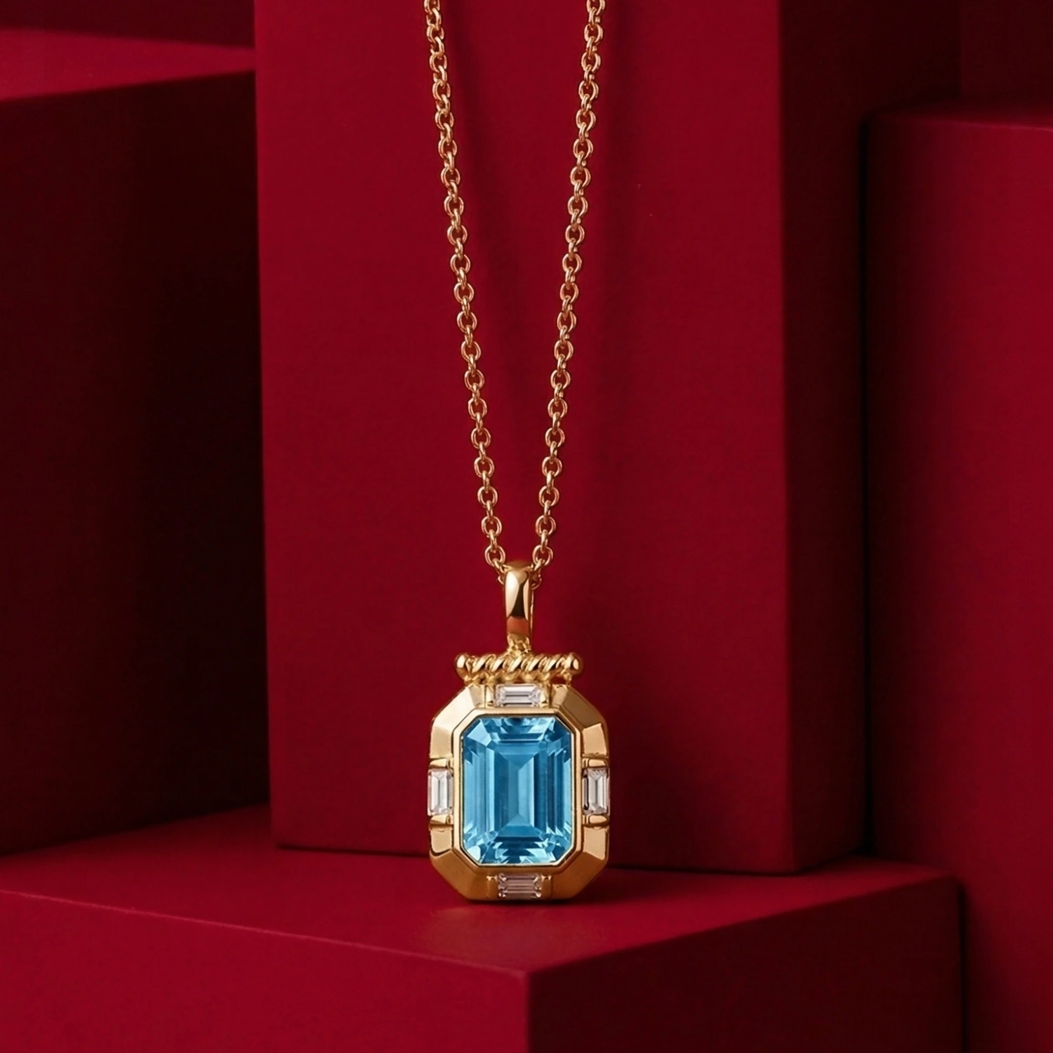 The Regal Azure Emerald-Cut Pendant is a luxurious gold-plated 925 sterling silver necklace featuring a striking sky-blue gemstone framed in a bold, vintage-inspired design.