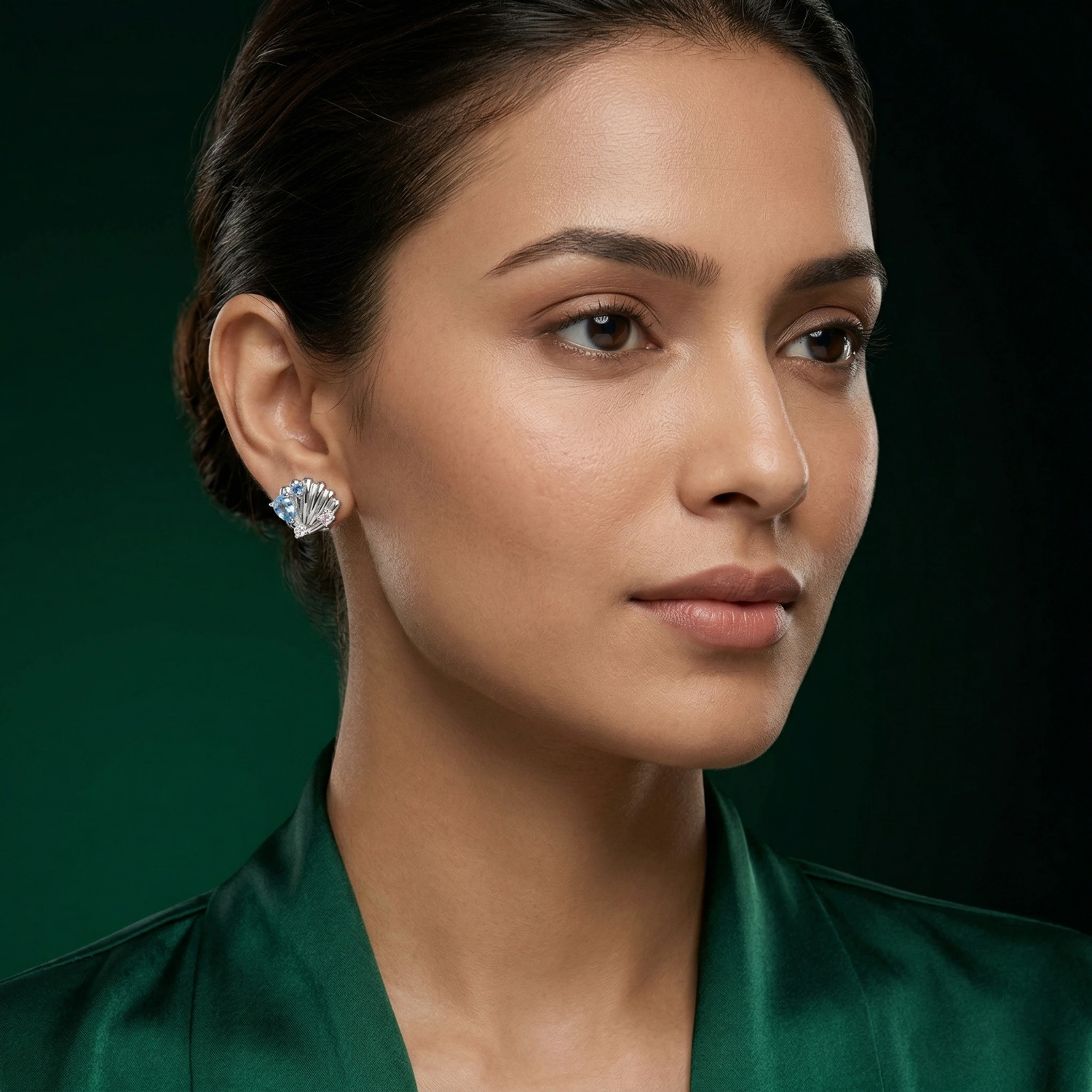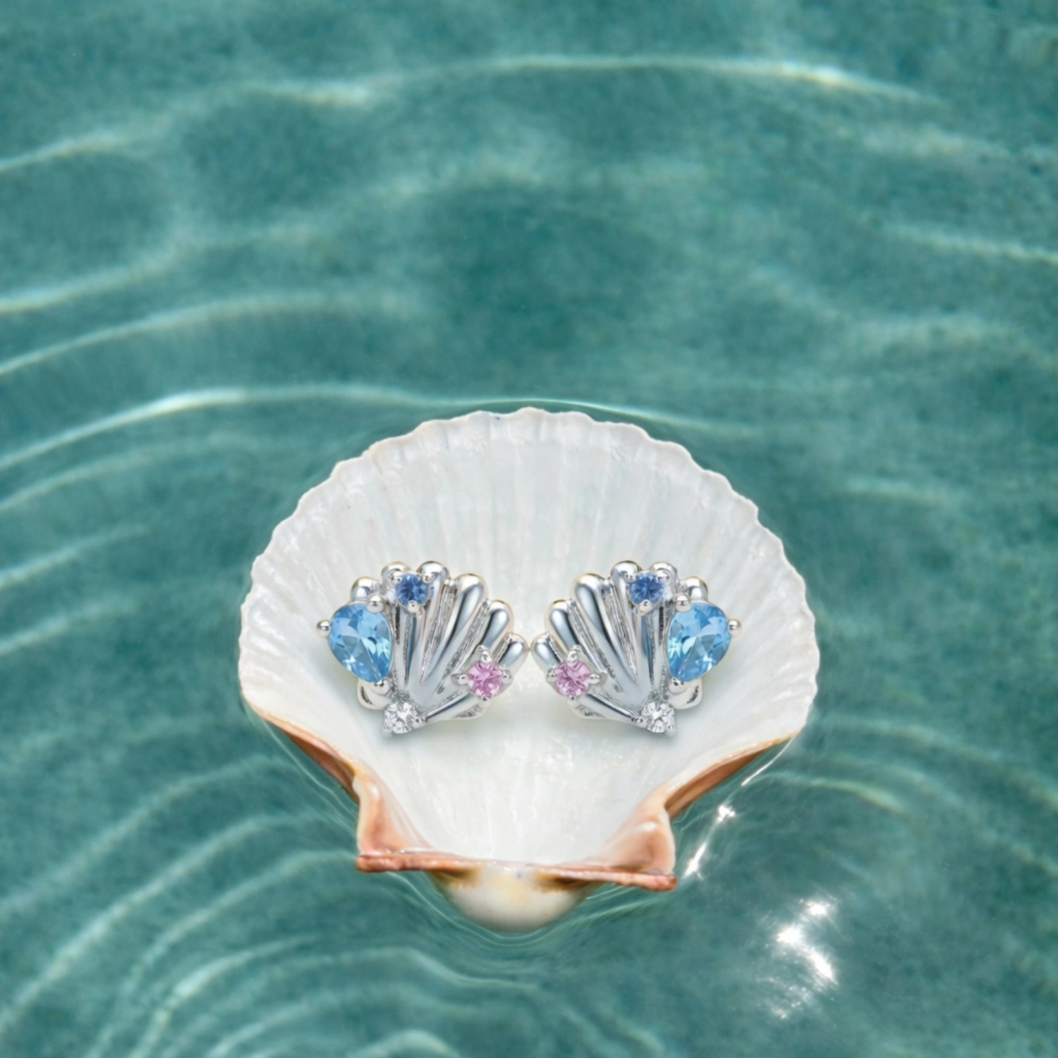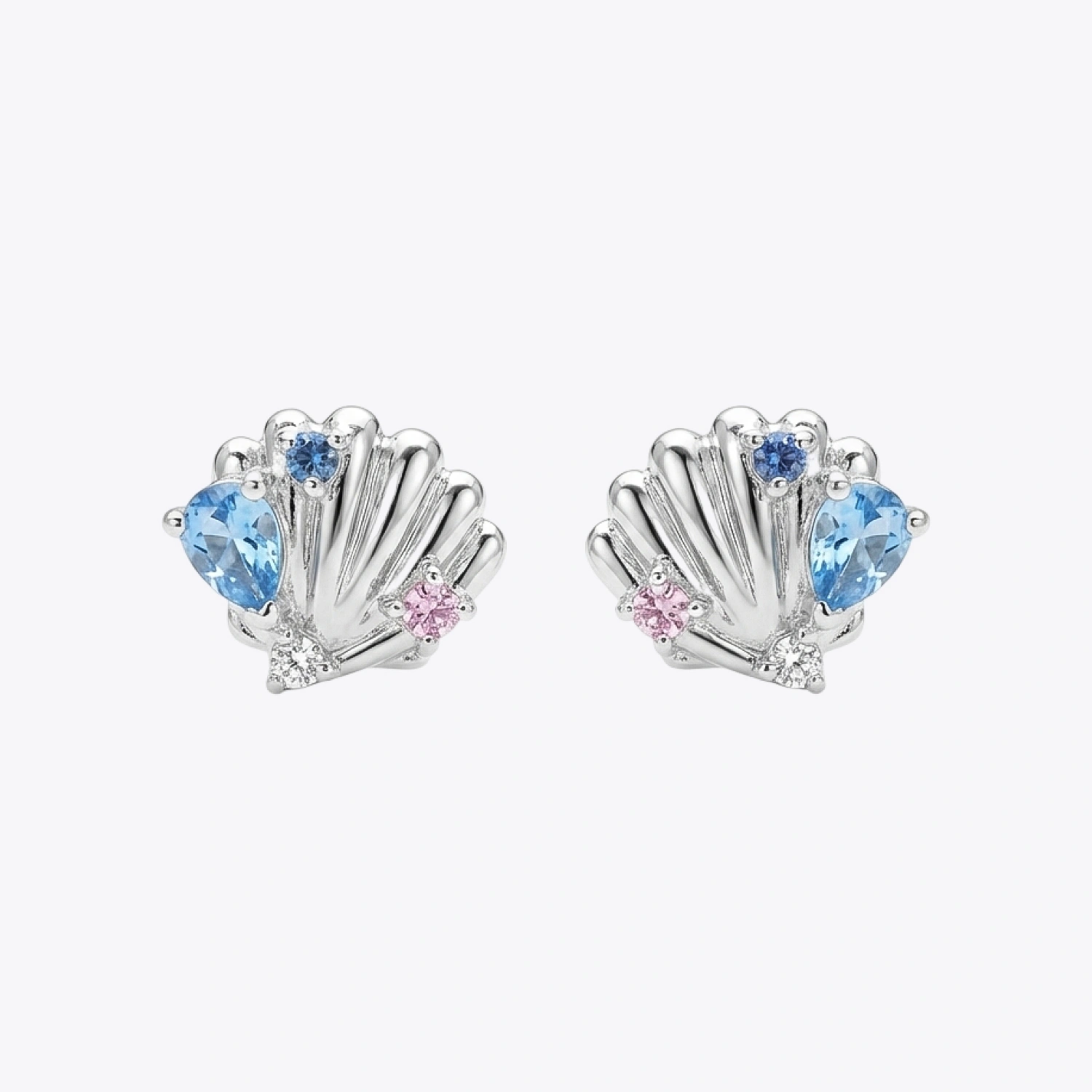 The Seaside Treasure Shell Studs are charming 925 sterling silver earrings inspired by ocean shells, featuring sparkling blue and pink gemstone accents.