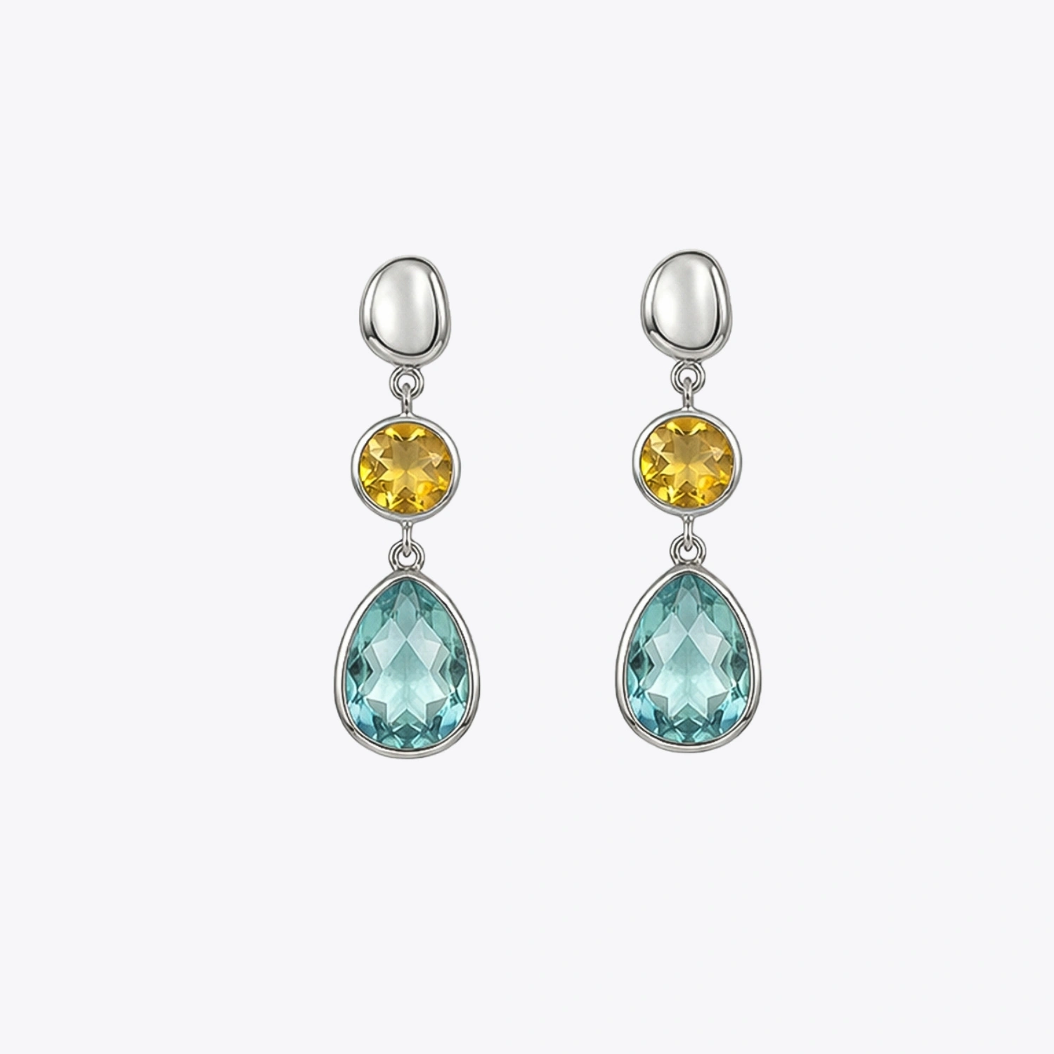 This elegant set features a pear-shaped blue crystal suspended beneath a round yellow gemstone, both secured in smooth polished bezel settings. The vibrant gemstone contrast creates a clean modern silhouette with playful sophistication.