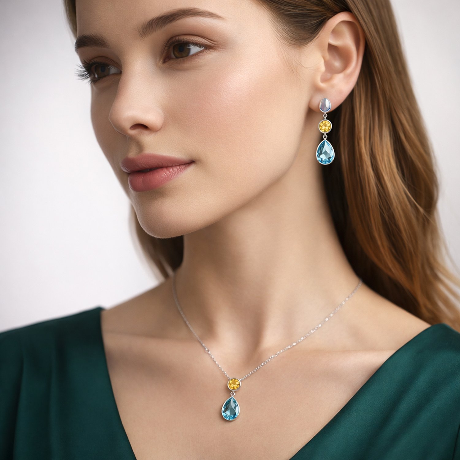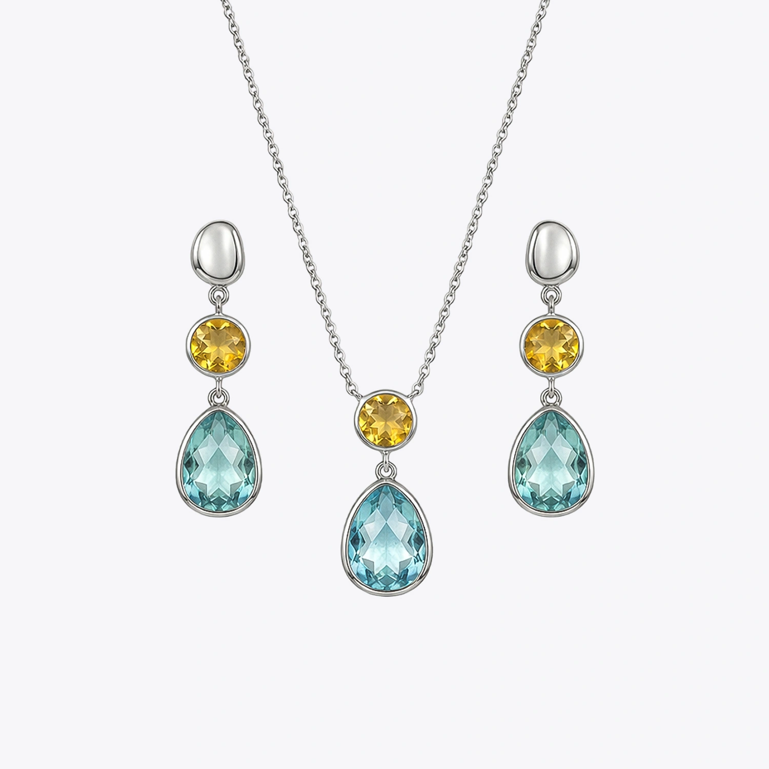 Each piece showcases a luminous pear-shaped blue crystal gracefully suspended from a brilliant round yellow gemstone, both encased in smooth polished bezel settings for a clean, modern finish. The vivid contrast between cool blue and sunny yellow creates a lively yet sophisticated statement, while the sterling silver frame adds timeless shine and structure. Crafted in premium 925 sterling silver with a high-polish finish, the set offers bright brilliance and versatile elegance.