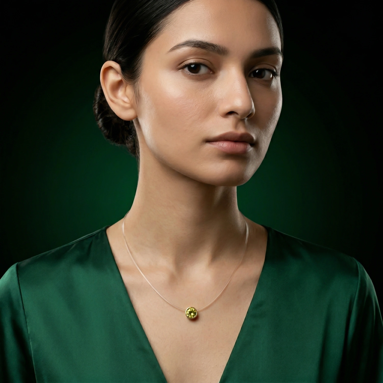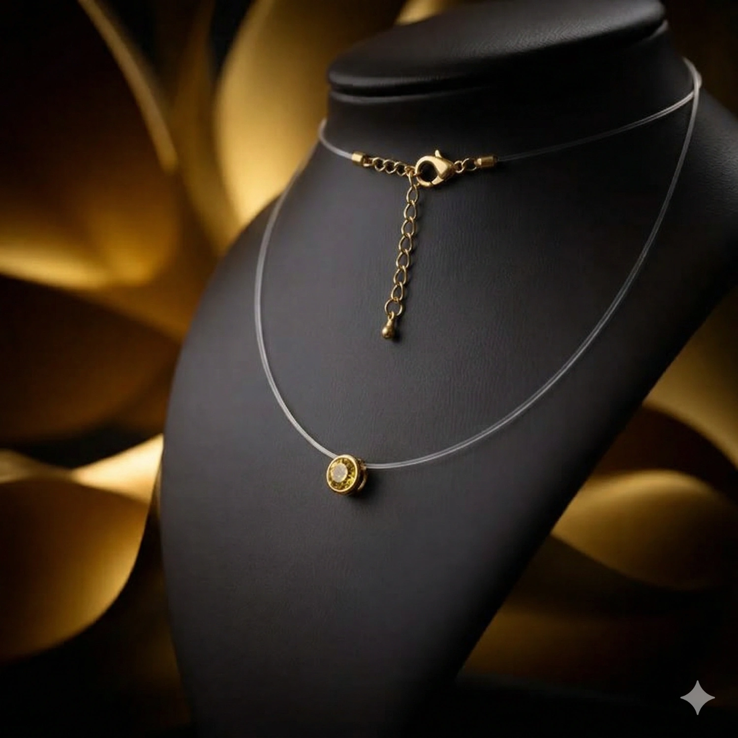 A minimalist gold-plated 925 silver pendant featuring a brilliant yellow stone on a near-invisible “floating” cord.