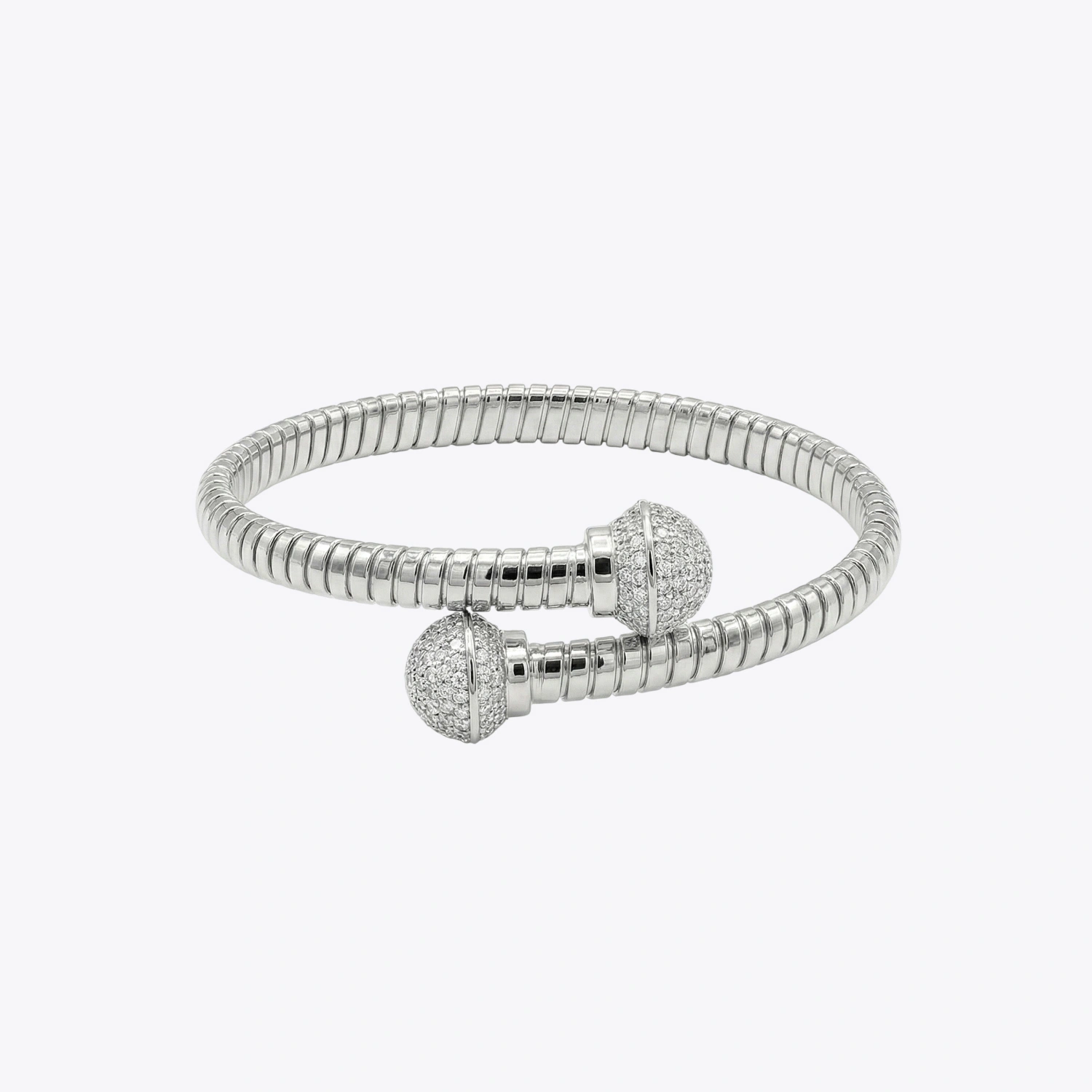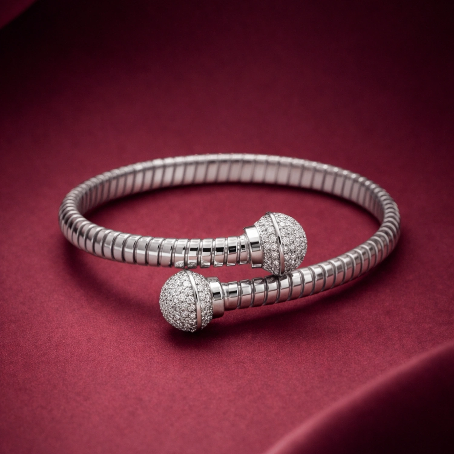 A luxurious 925 sterling silver flexible cuff featuring a classic ribbed texture, capped with two dazzling, crystal-paved spherical terminals.