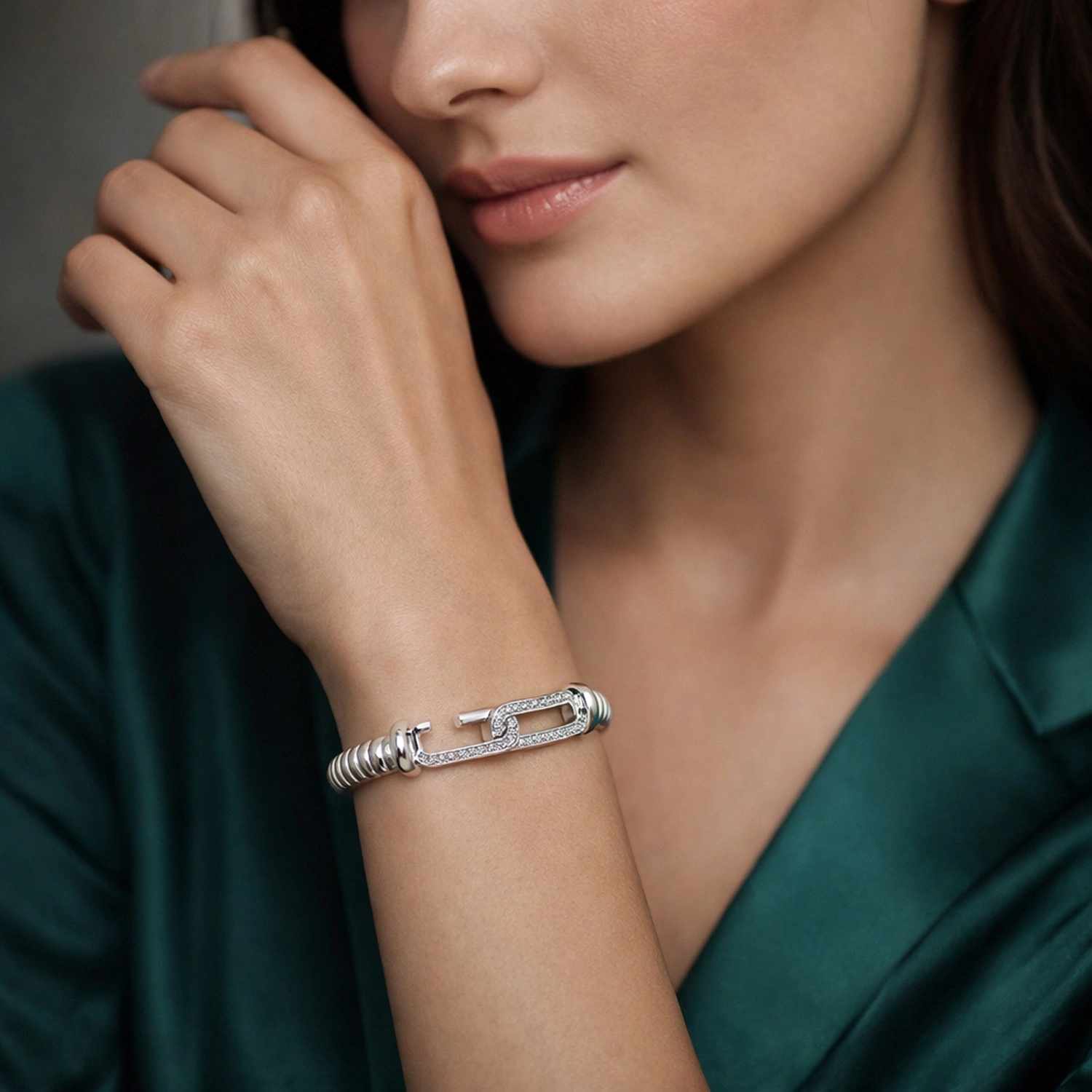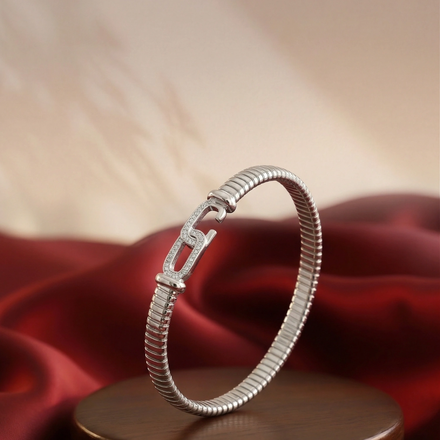 The Alencia Crystal Link Ribbed Kada is a sophisticated 925 sterling silver bracelet featuring a textured ribbed band secured with a dazzling crystal-encrusted hook closure for a refined and modern look.