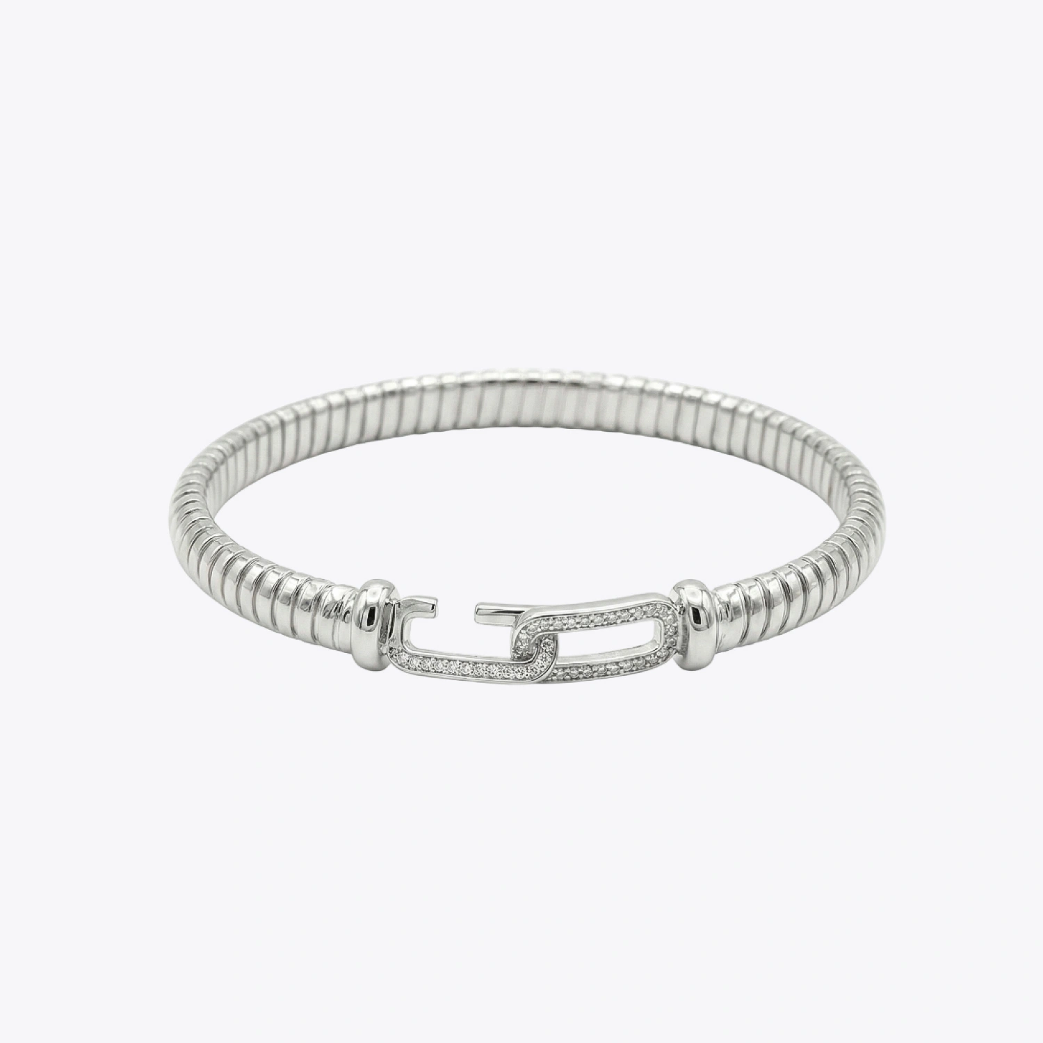A sophisticated 925 sterling silver bracelet featuring a textured ribbed band secured by a dazzling, crystal-encrusted hook closure.