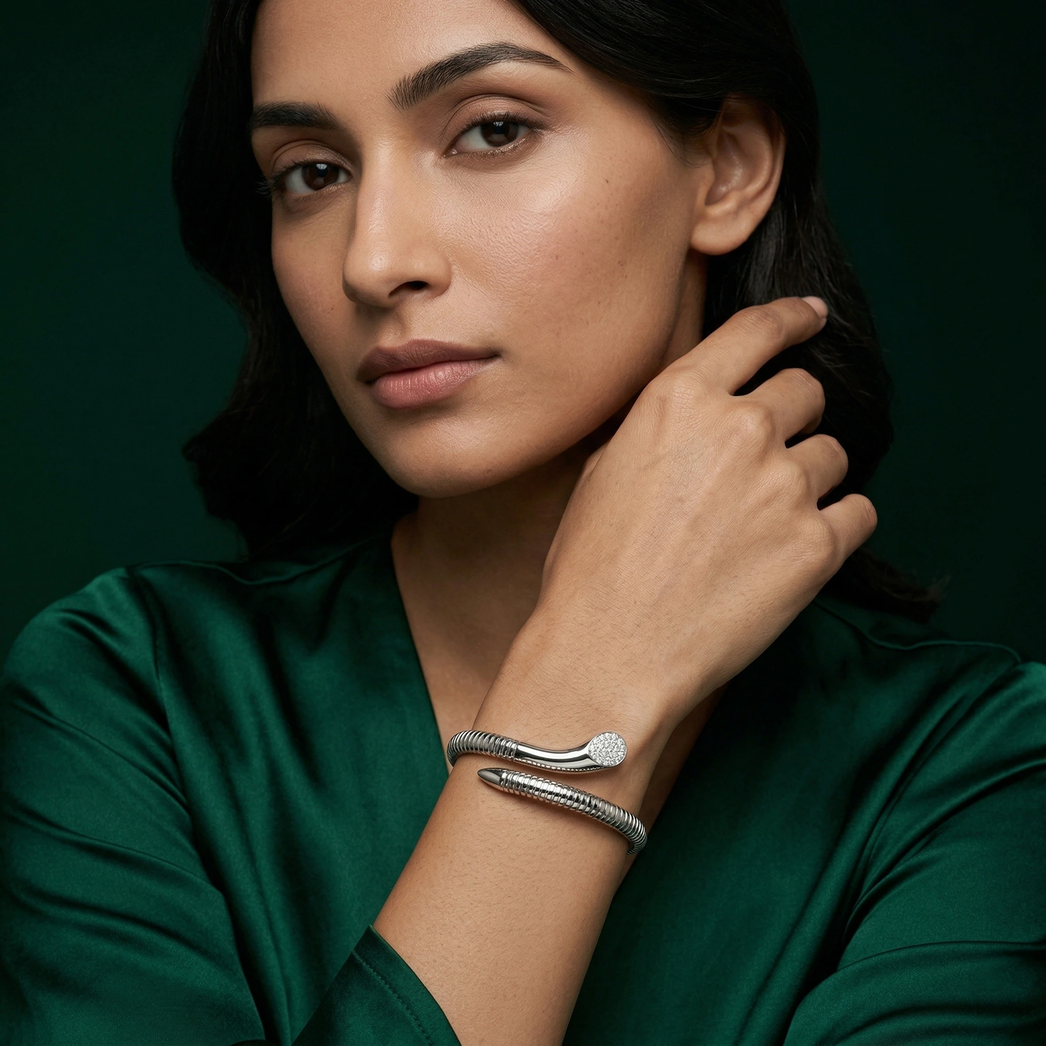 The Alencia Crystal Wrap Flex Kada is a striking 925 sterling silver bangle featuring a modern ribbed design that wraps elegantly around the wrist, creating a bold and contemporary statement.