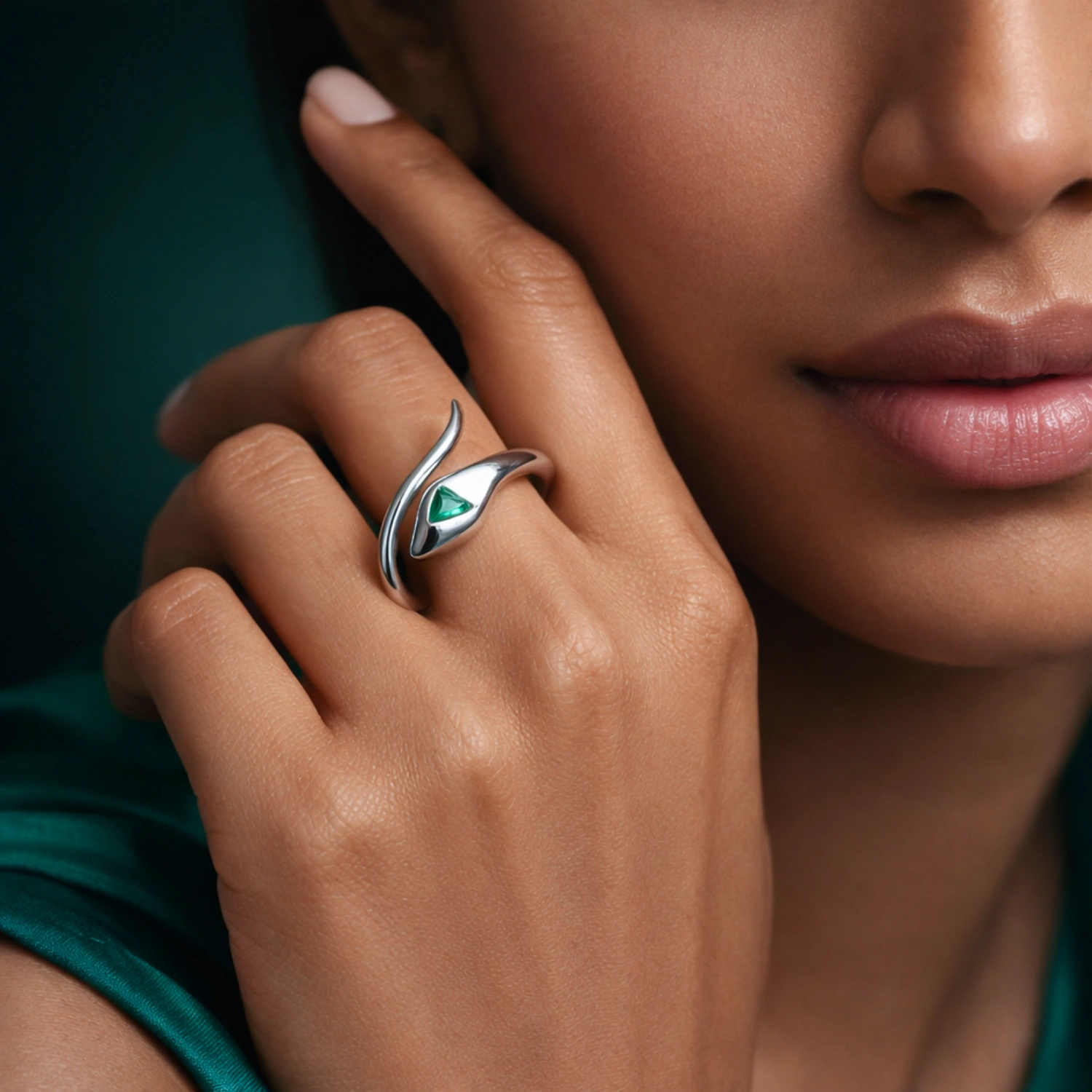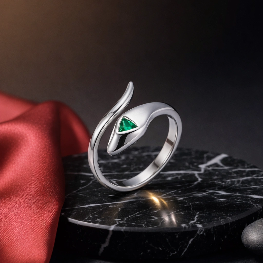 The Alencia Emerald Serpent Ring is crafted in 925 sterling silver, featuring a sleek coiling snake design accented with a vivid green triangular stone. A bold piece that blends modern elegance with edgy sophistication.
