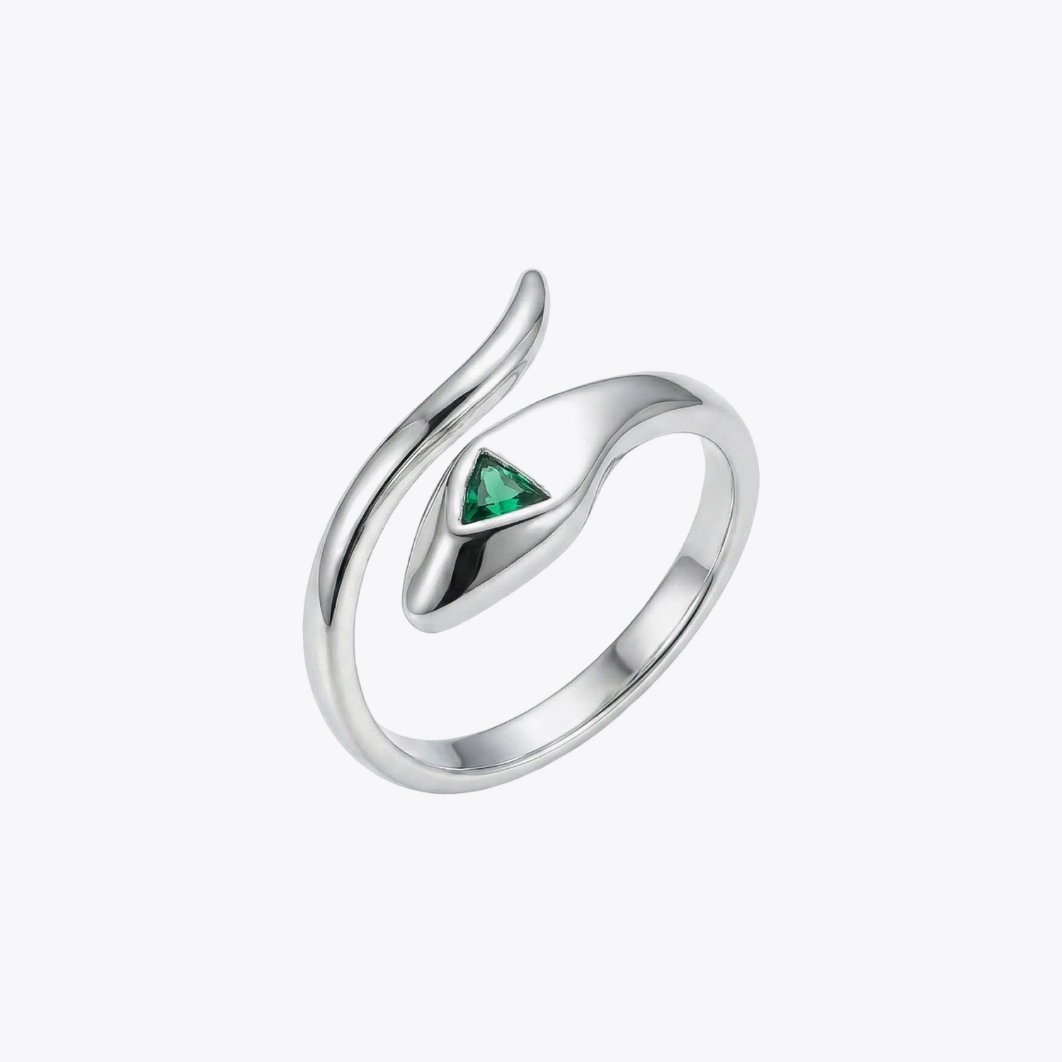 Crafted in lustrous 925 sterling silver, this ring features a sleek coiling snake design accented with a vivid green triangular stone.
