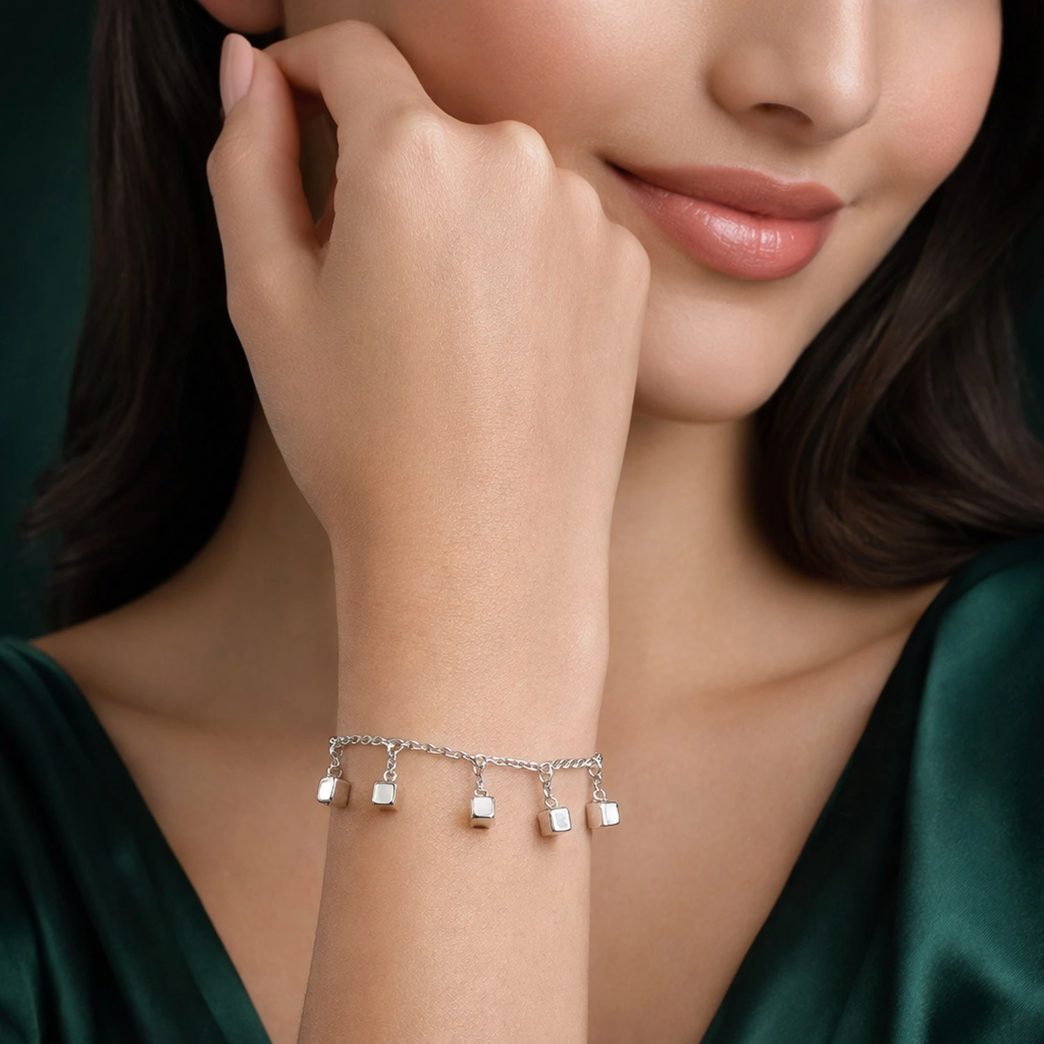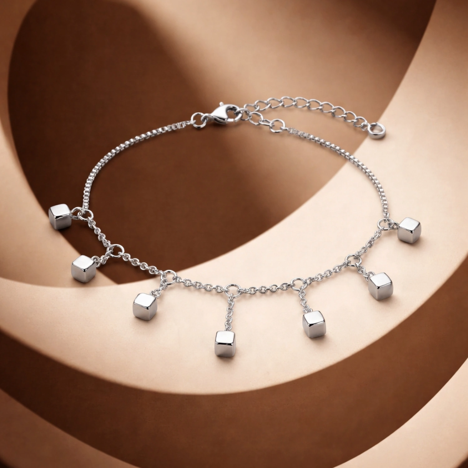 A sophisticated 925 sterling silver bracelet featuring polished cube charms that catch the light with every movement.
