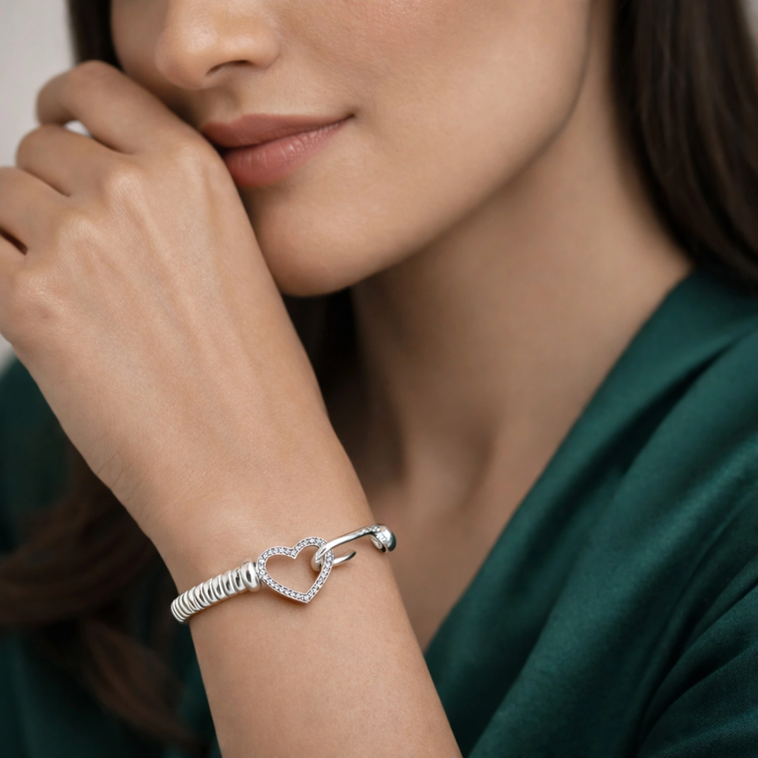 The Alencia Open Heart Ribbed Kada is a chic 925 sterling silver bracelet featuring a classic ribbed texture, beautifully finished with a sparkling open-heart closure for a romantic yet modern look.