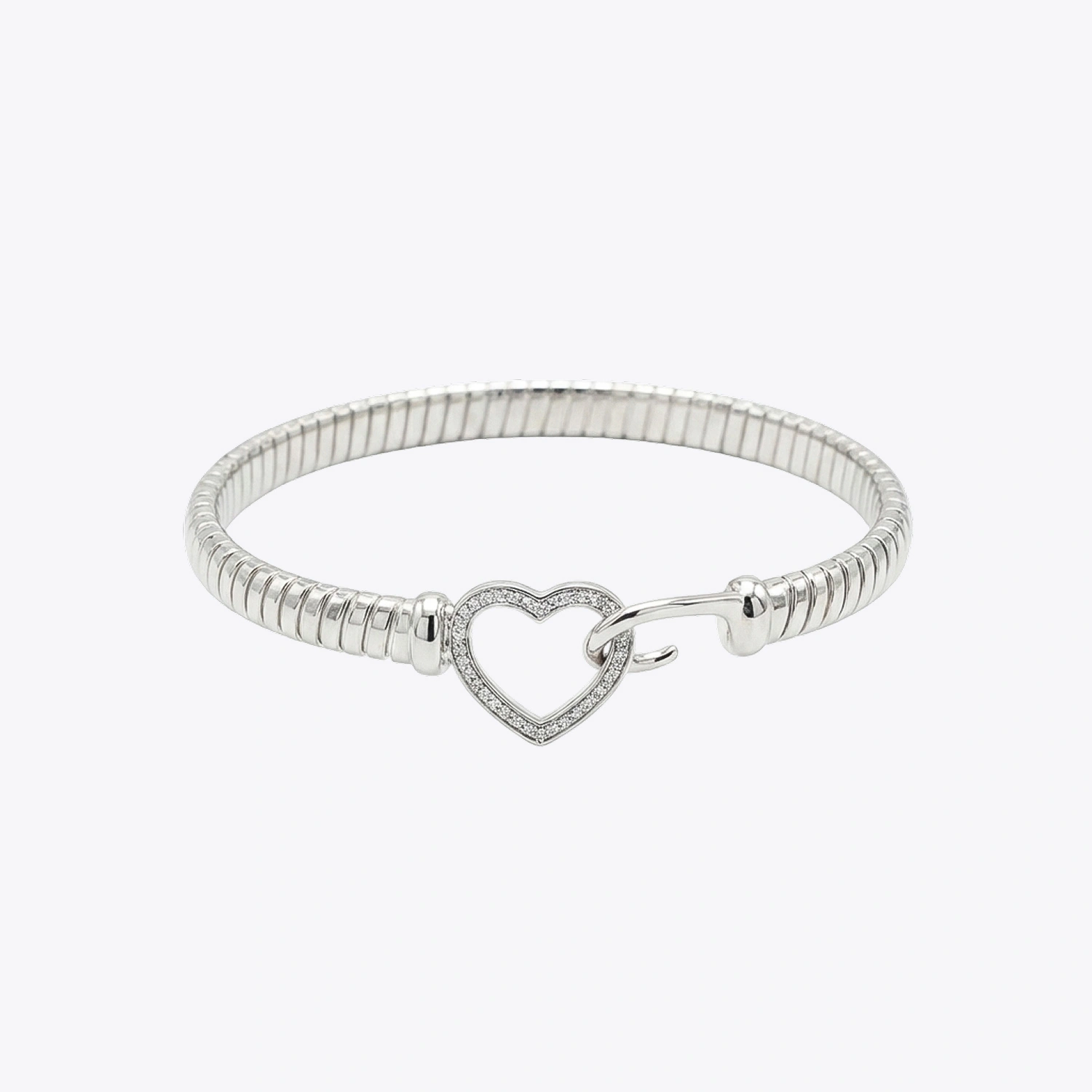 A chic 925 sterling silver flexible bracelet featuring a classic ribbed texture and a sparkling, open-heart hook closure.