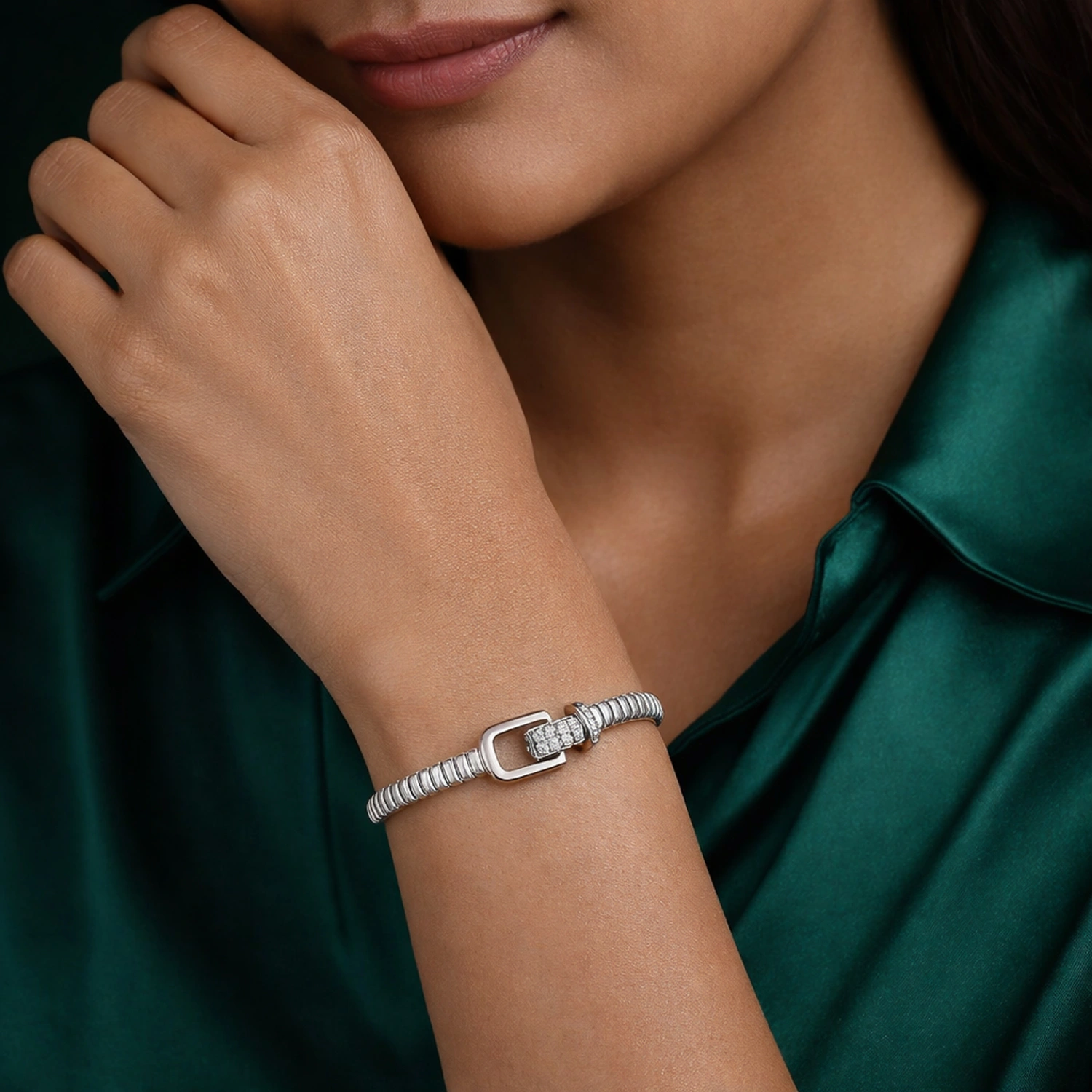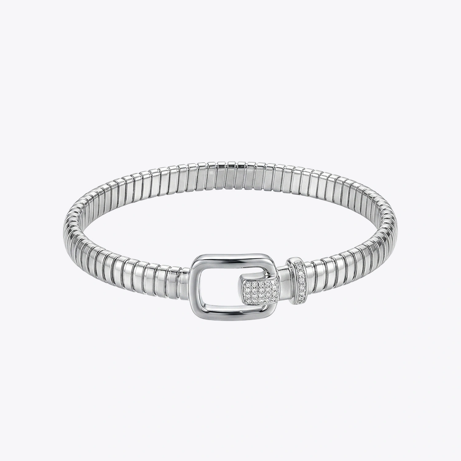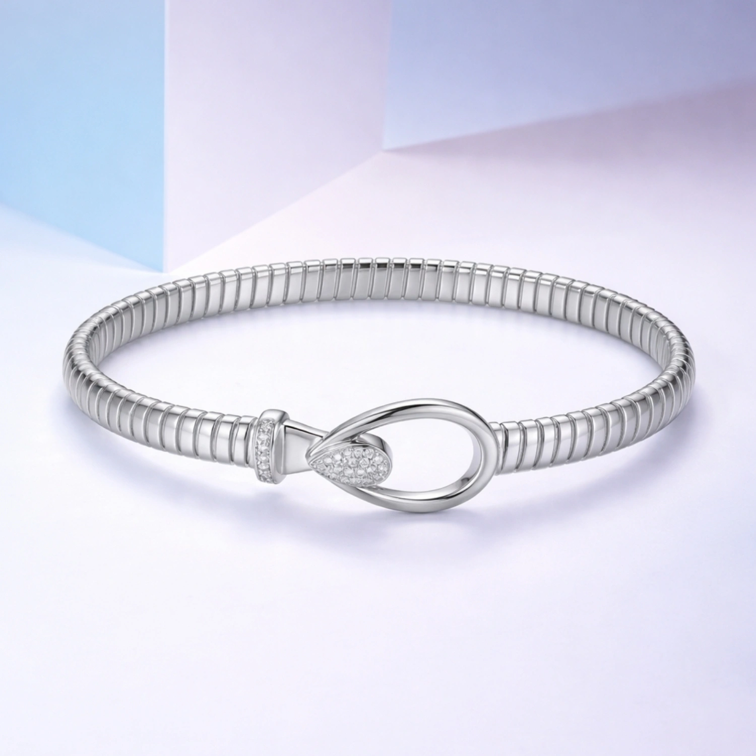 The Alencia Pave Teardrop Loop Kada is a sleek 925 sterling silver bracelet featuring a ribbed band paired with a sophisticated crystal-studded teardrop loop closure for a refined and modern finish.
