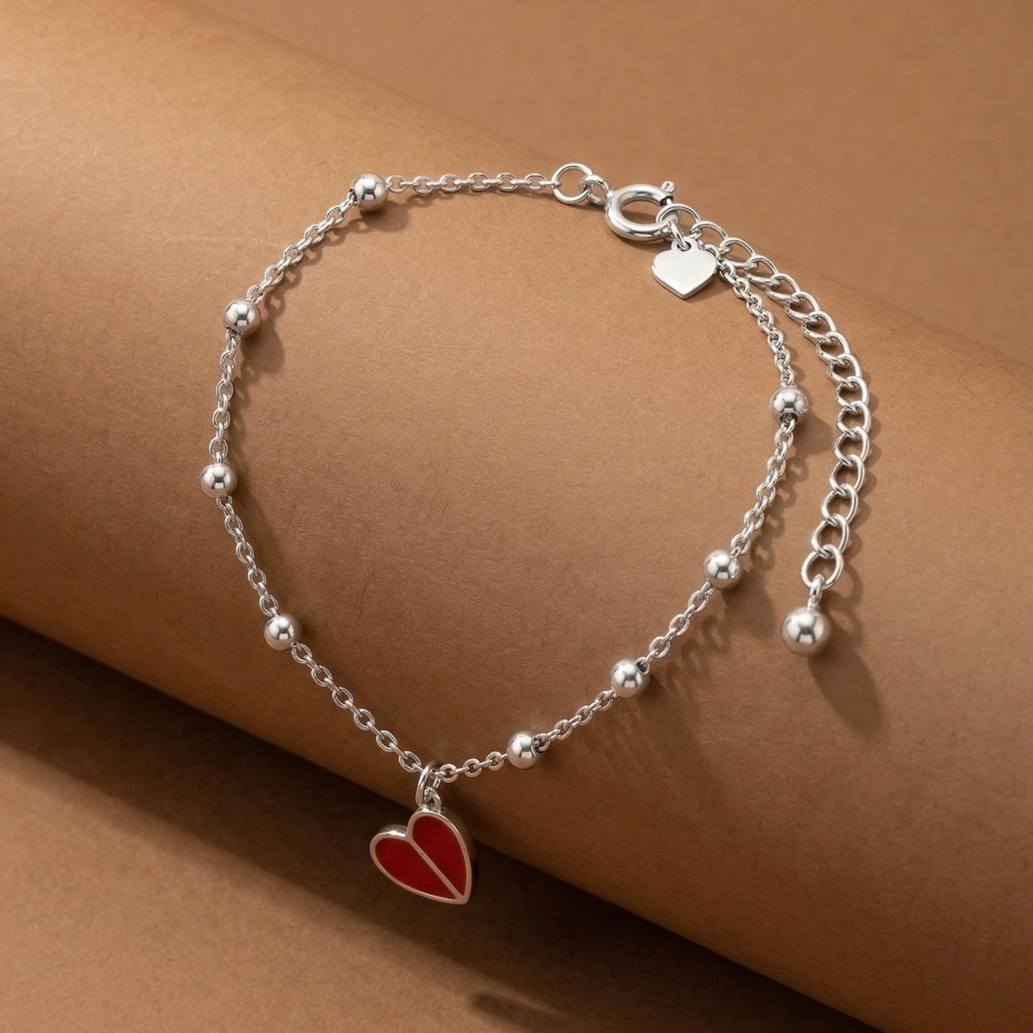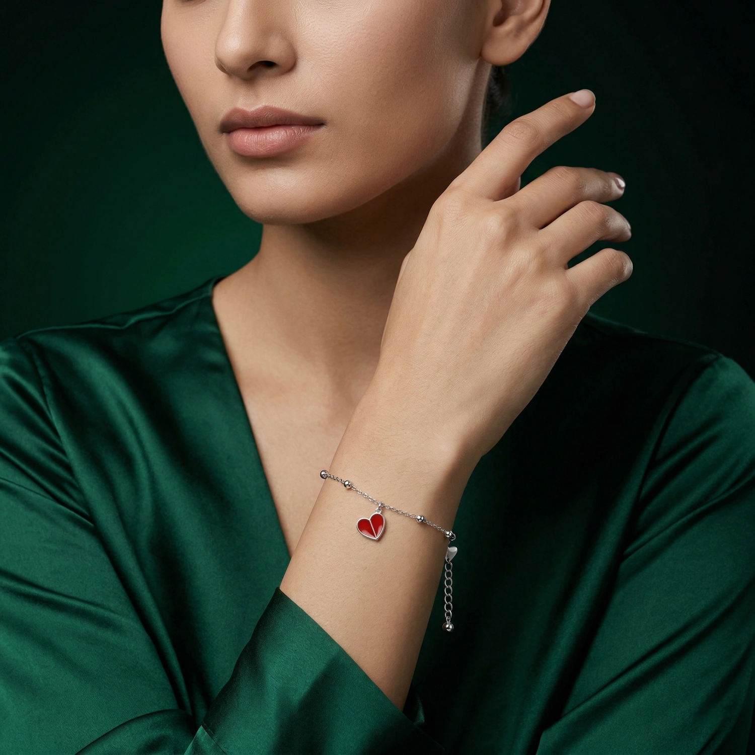 The Alencia Ruby-Red Heart Enamel Bracelet is a romantic 925 sterling silver bracelet featuring a vibrant red enamel heart charm accented with elegant silver beads.