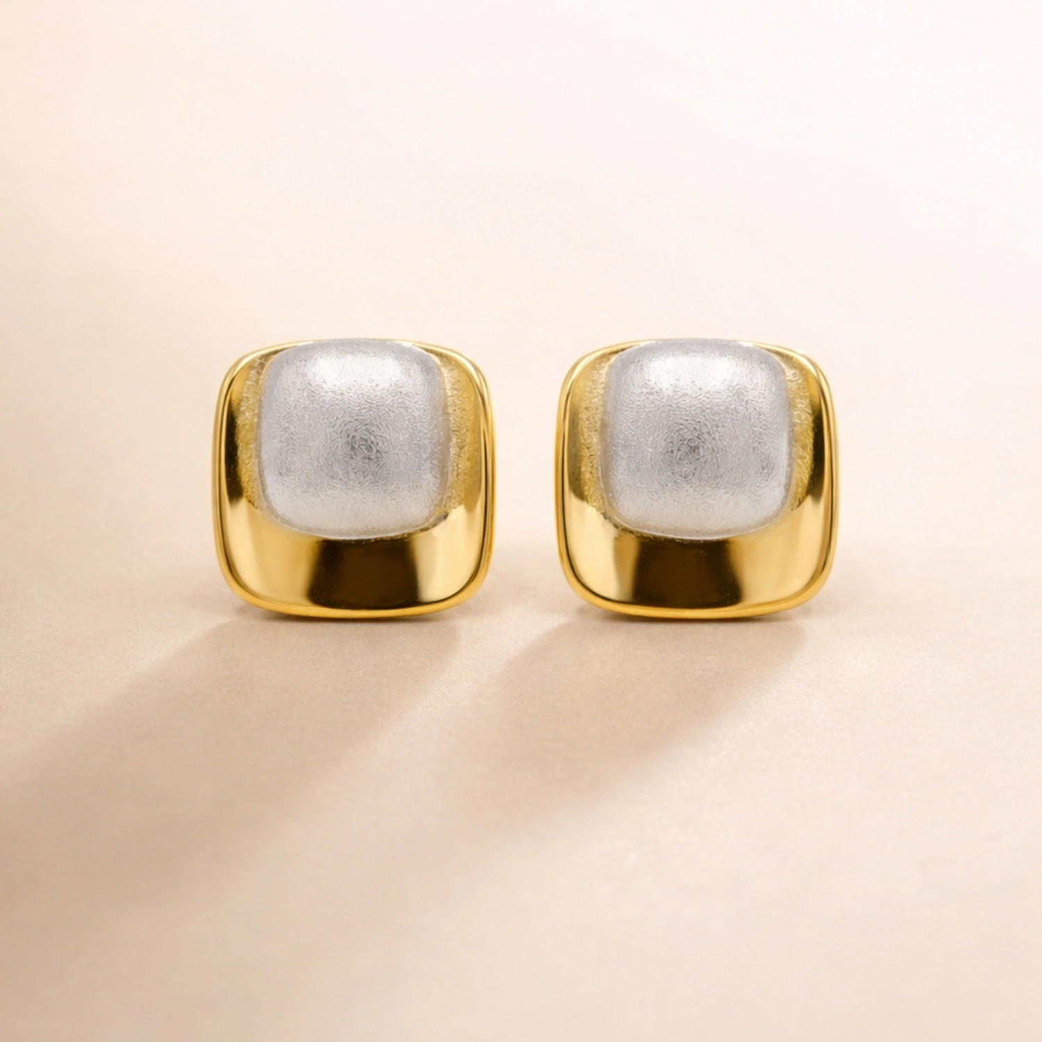 Modern square stud earrings crafted in 925 sterling silver, featuring a sophisticated blend of silver and gold hues.