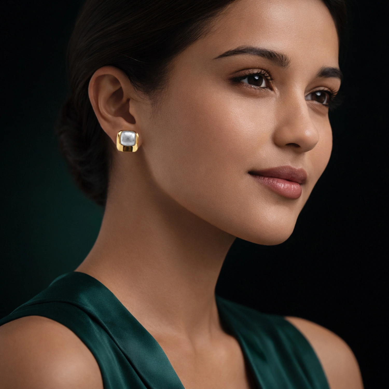 The Aura Dual-Tone Square Studs are modern 925 sterling silver earrings featuring a sophisticated blend of silver and gold tones, designed to add a refined and contemporary touch to your look.