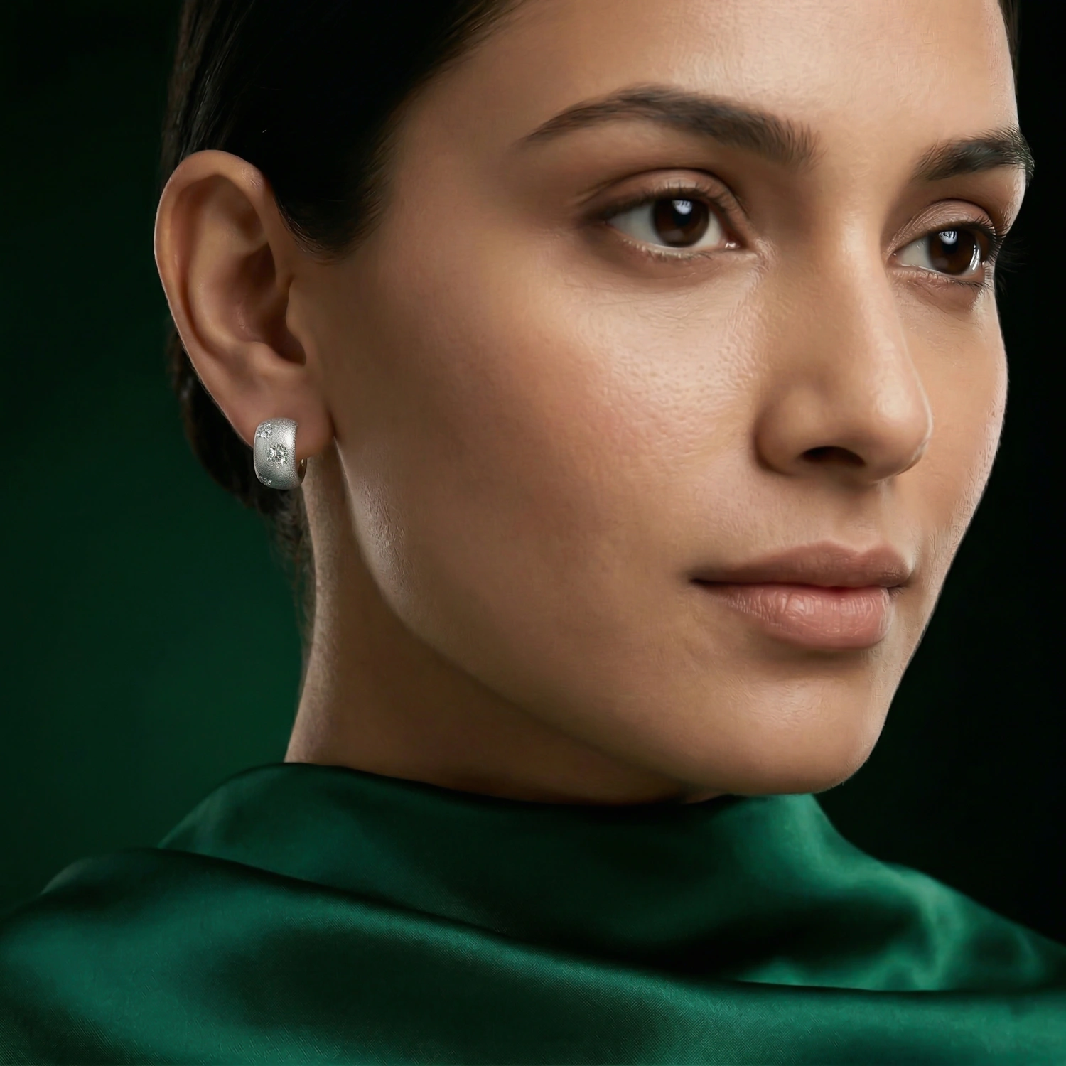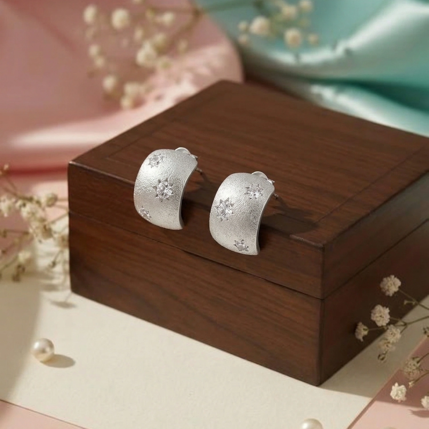 The Celestial Stardust Wide Hoops are dreamy 925 sterling silver huggie earrings featuring a textured, star-inspired design with sparkling accents that capture the magic of a night sky.