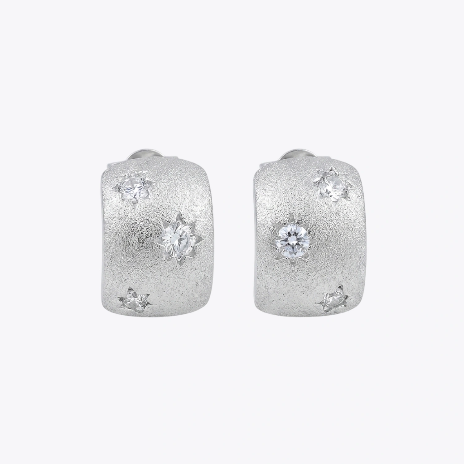 Dreamy wide huggie hoops crafted in 925 sterling silver, featuring a unique textured finish dotted with sparkling accents.