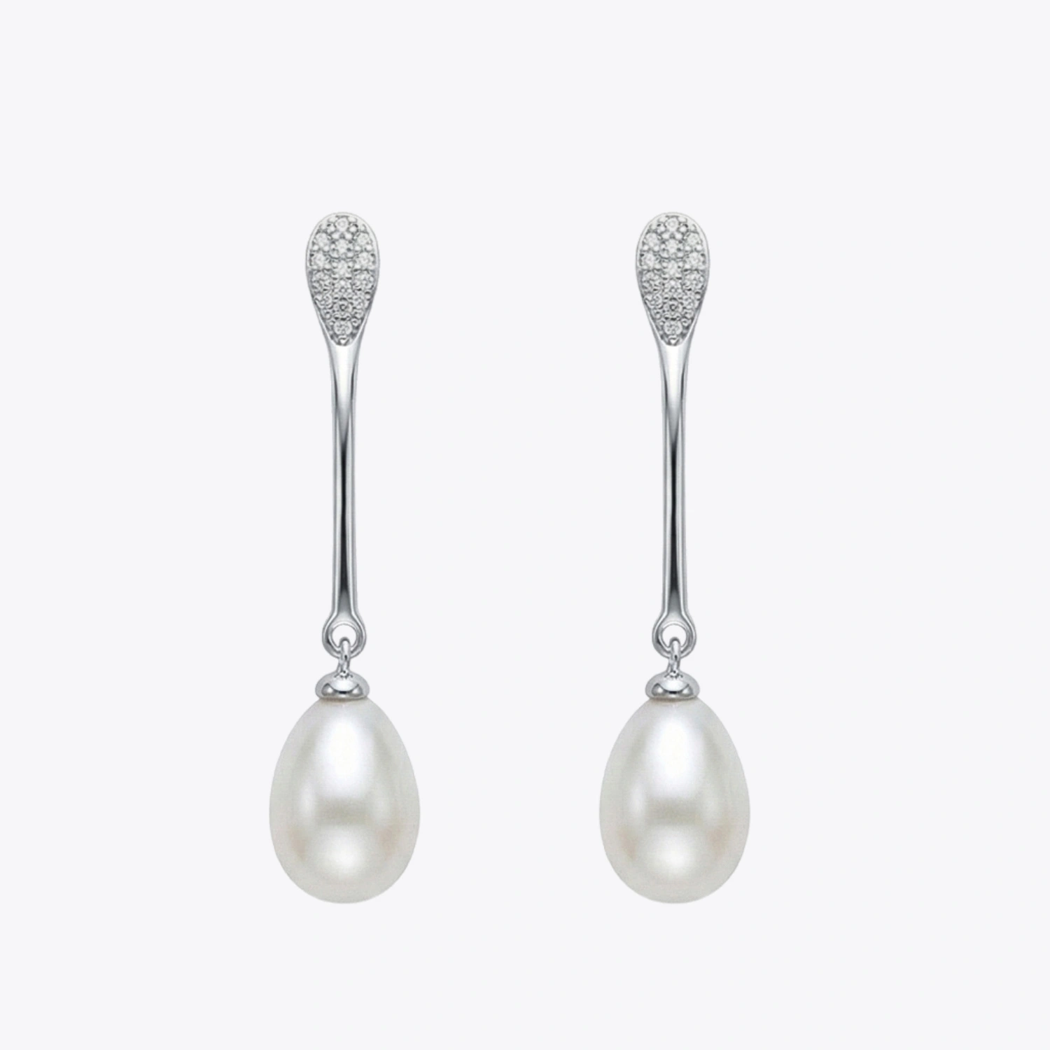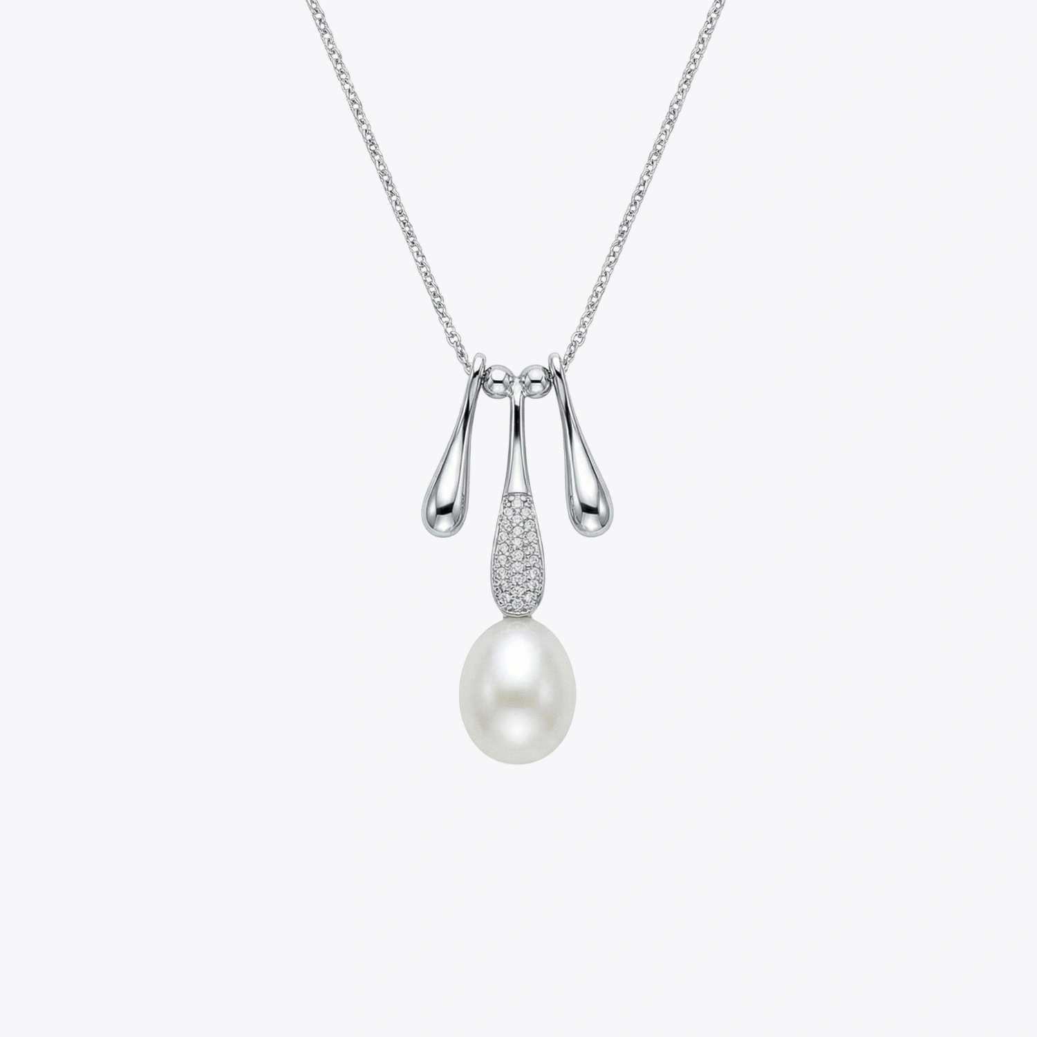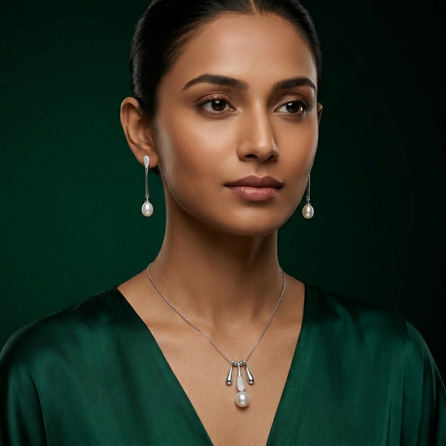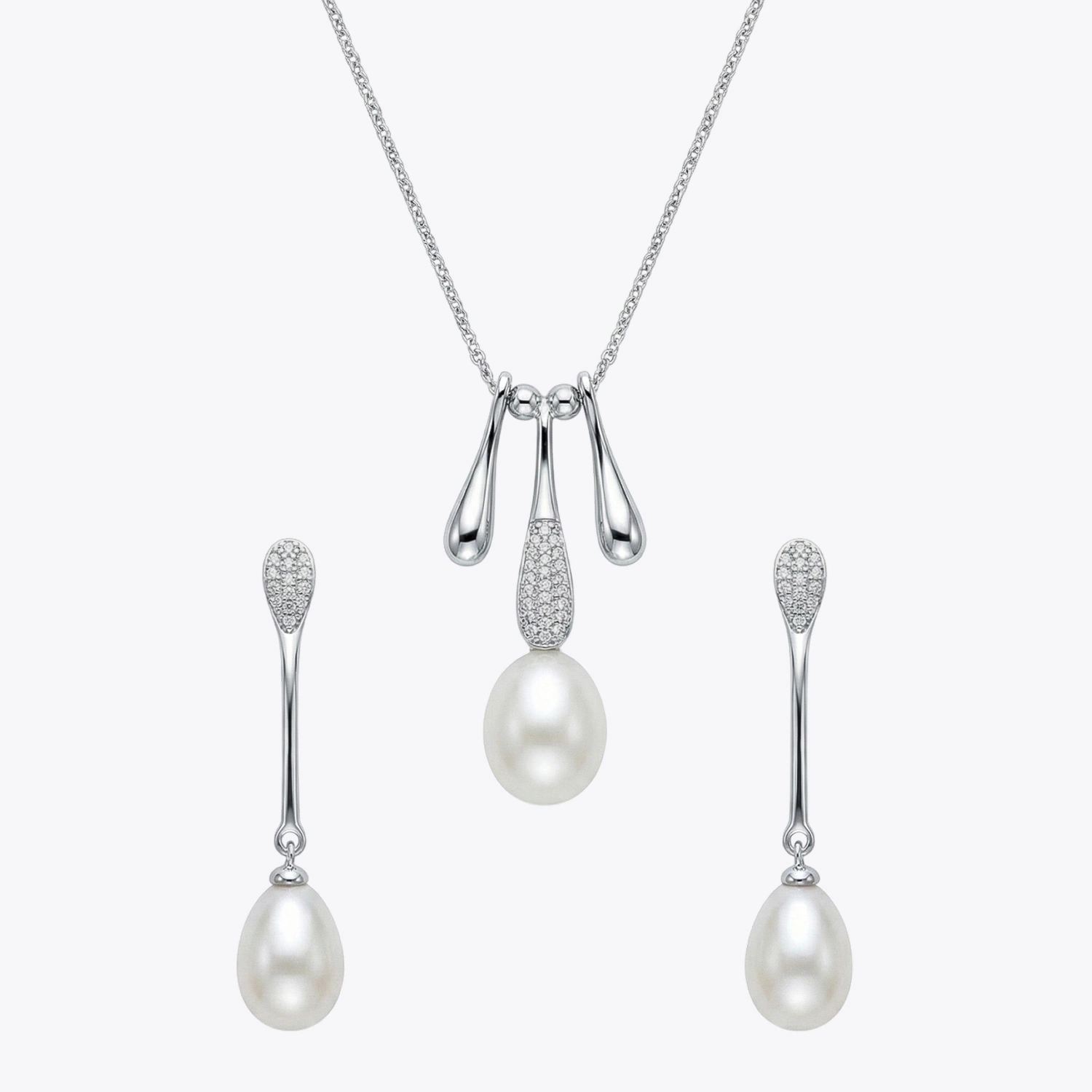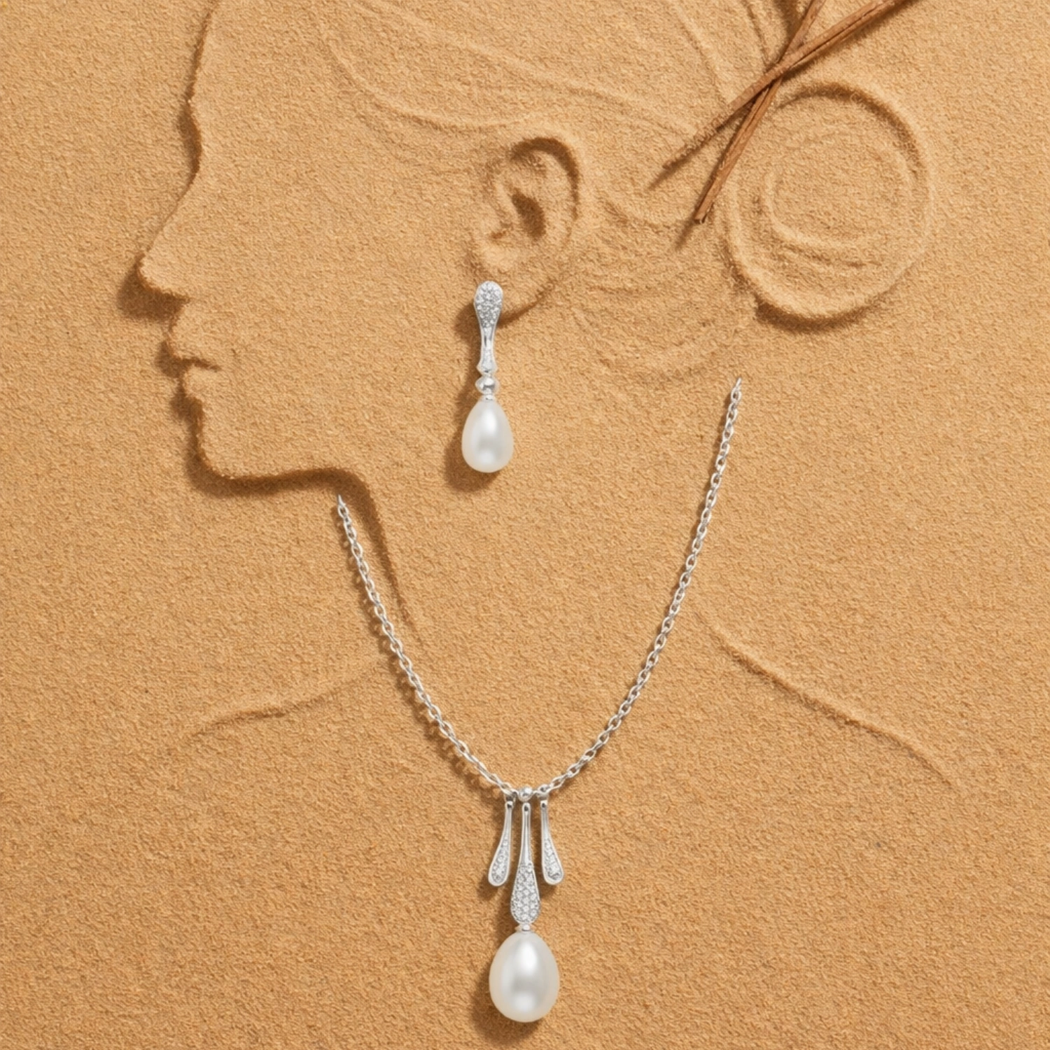 Crafted from premium sterling silver, the pendant showcases a stunning triple-drop design with luminous teardrop pearls arranged in graceful vertical flow. Fine pavé-set stones add delicate sparkle along the slender silver lines, enhancing the brilliance and creating an elongated elegant effect. The matching earrings mirror the same vertical sophistication, making the entire set ideal for elevated occasion styling. Finished in a high-polish rhodium coating, the silver radiates a mirror-like shine that perfectly complements the lustrous white pearls.