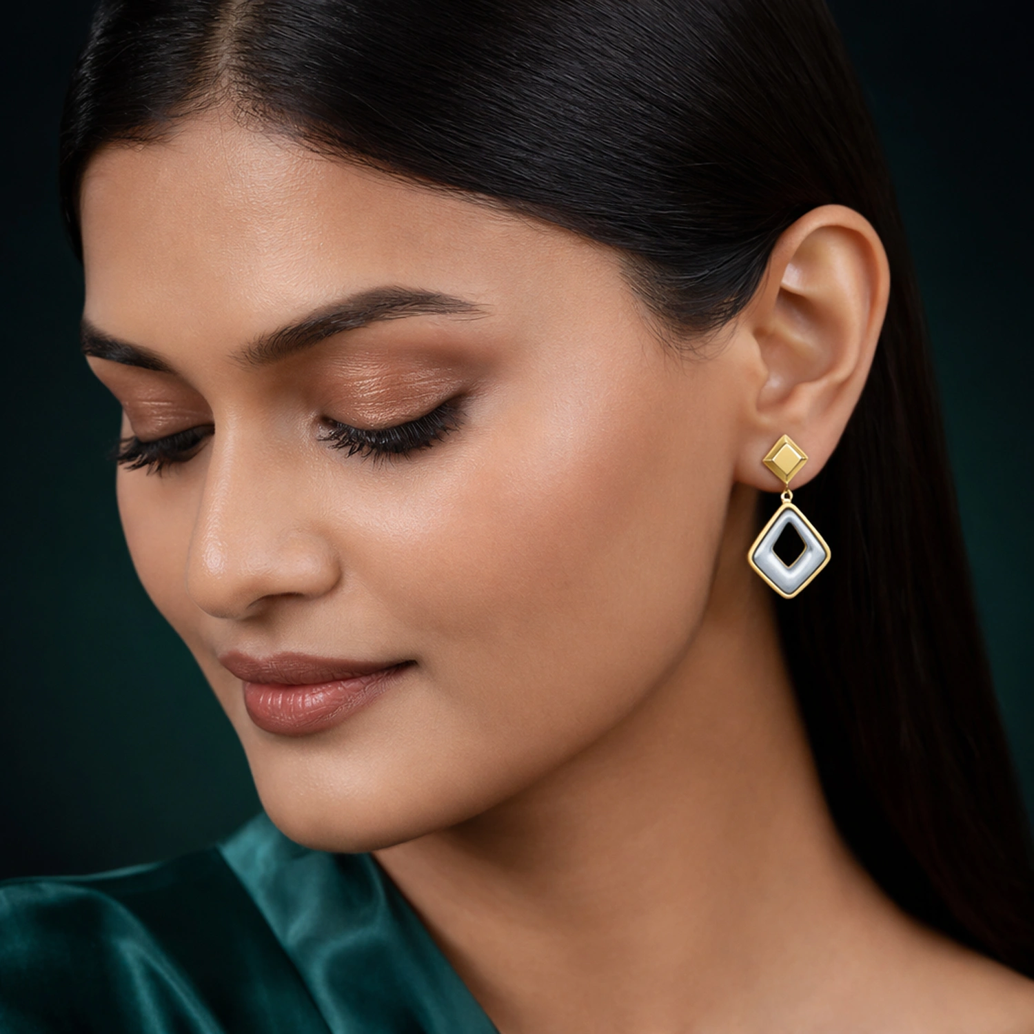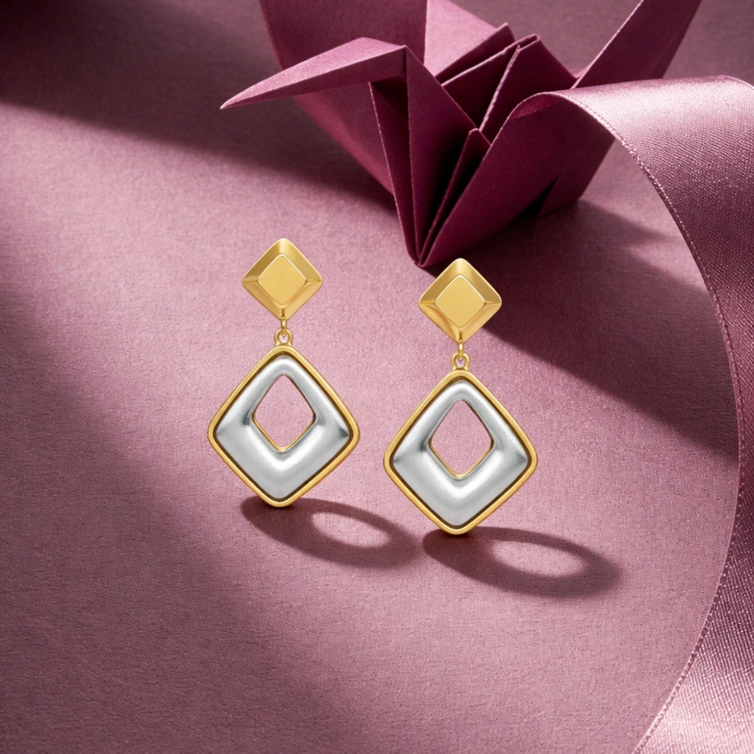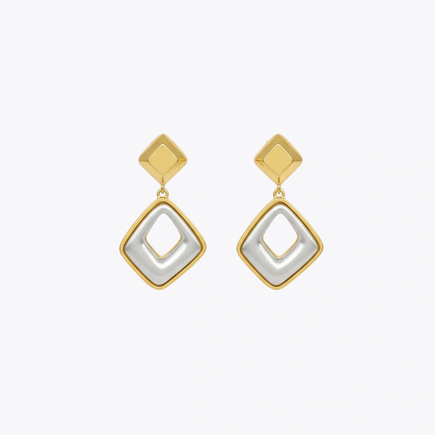 The Geo-Luxe Two-Tone Drop Earrings are contemporary 925 sterling silver earrings featuring a bold geometric silhouette enhanced with luxurious gold plating for a striking modern look.