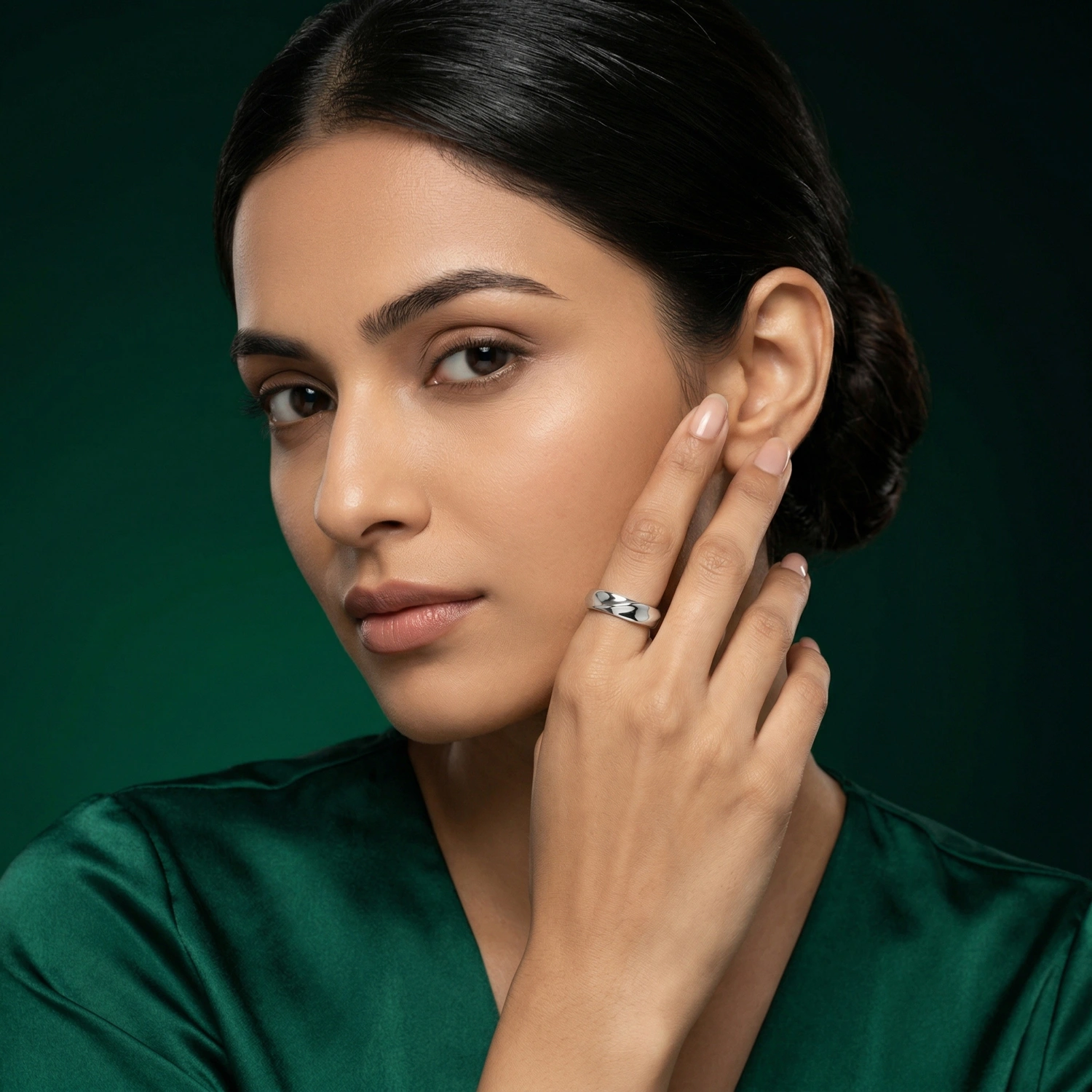 The Sculpted Twist Ring is a sophisticated 925 sterling silver band featuring a subtle fluid twist, adding modern dimension to a timeless silhouette.