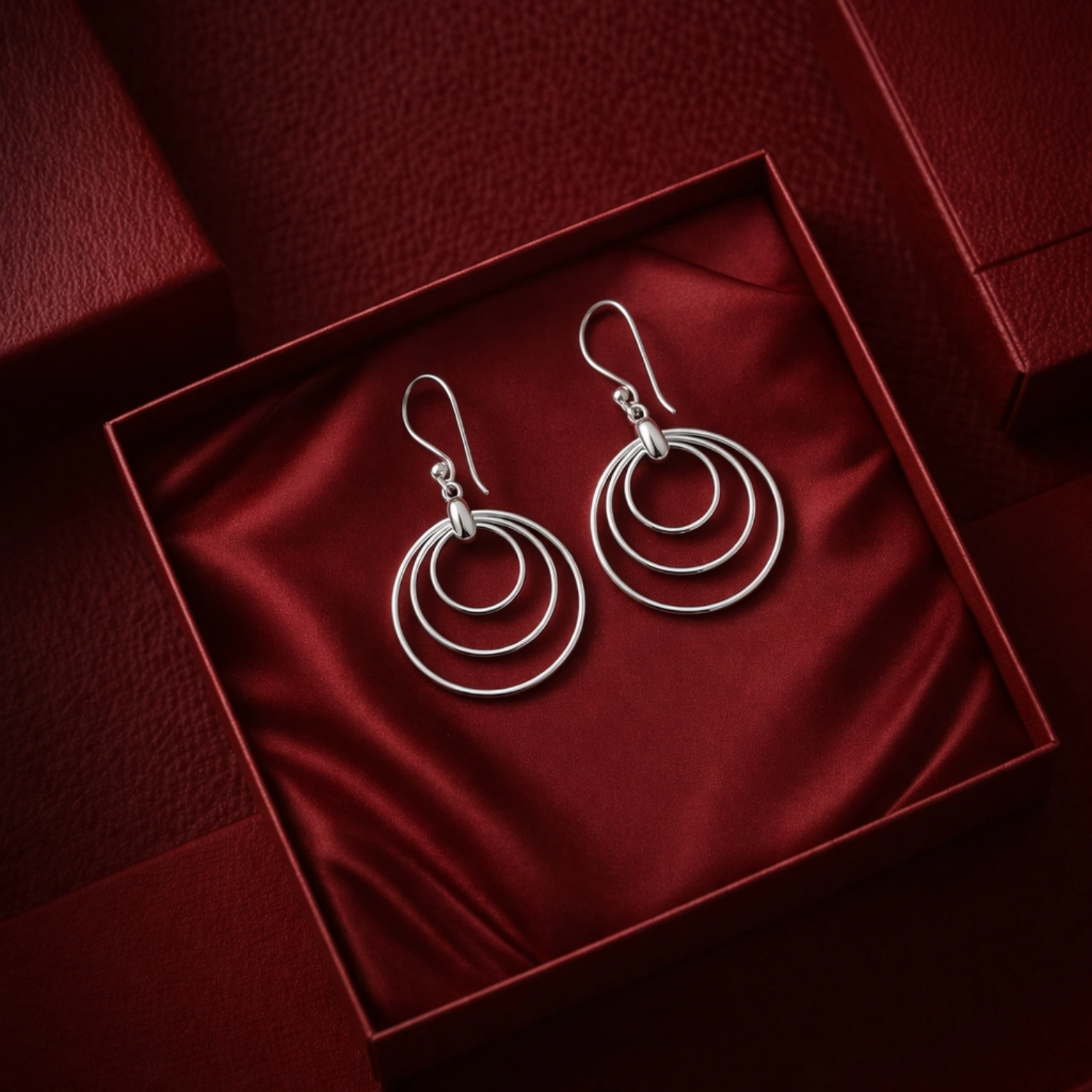 The Triple Orbit Drop Earrings are graceful 925 sterling silver earrings featuring three concentric circles, creating a lightweight and modern geometric statement.