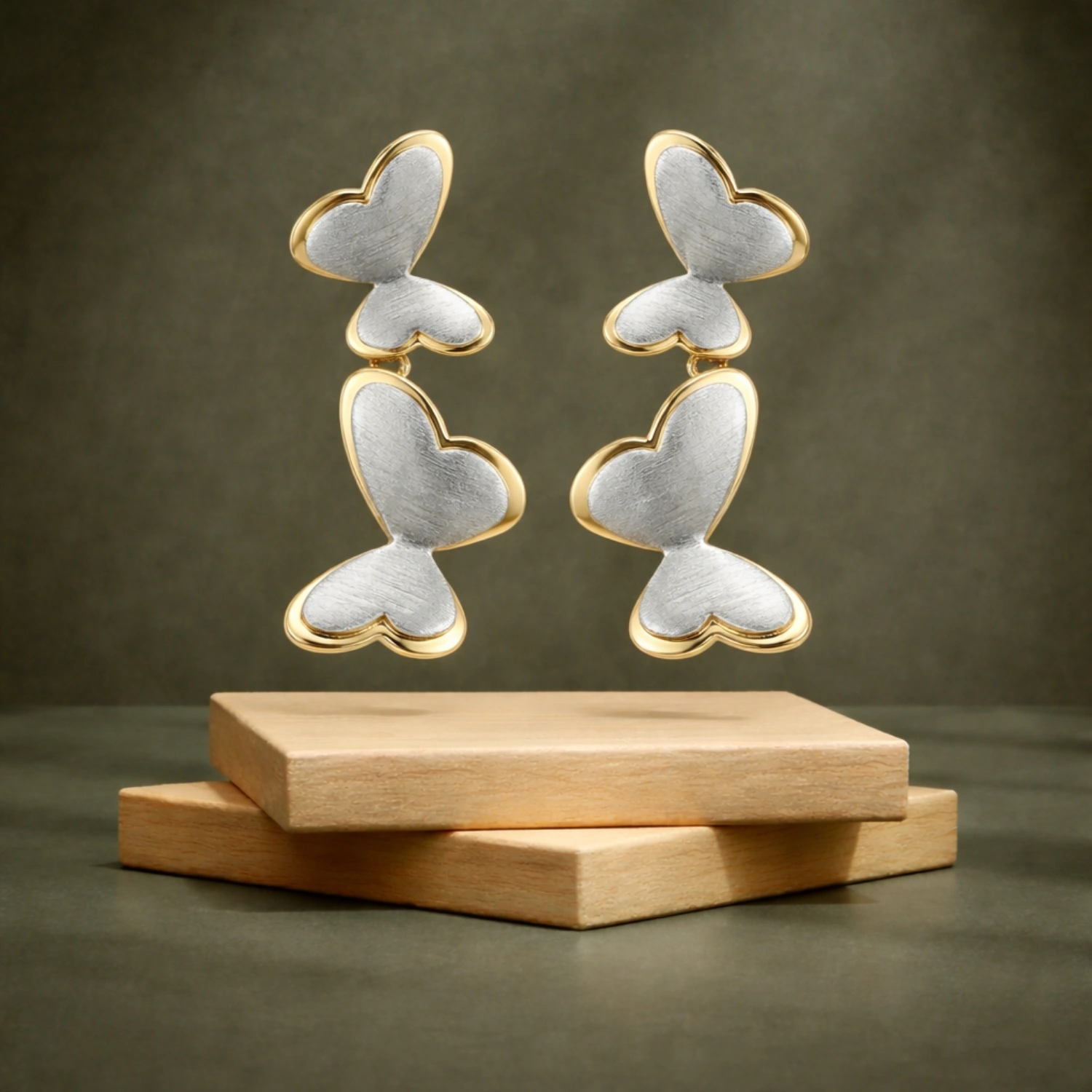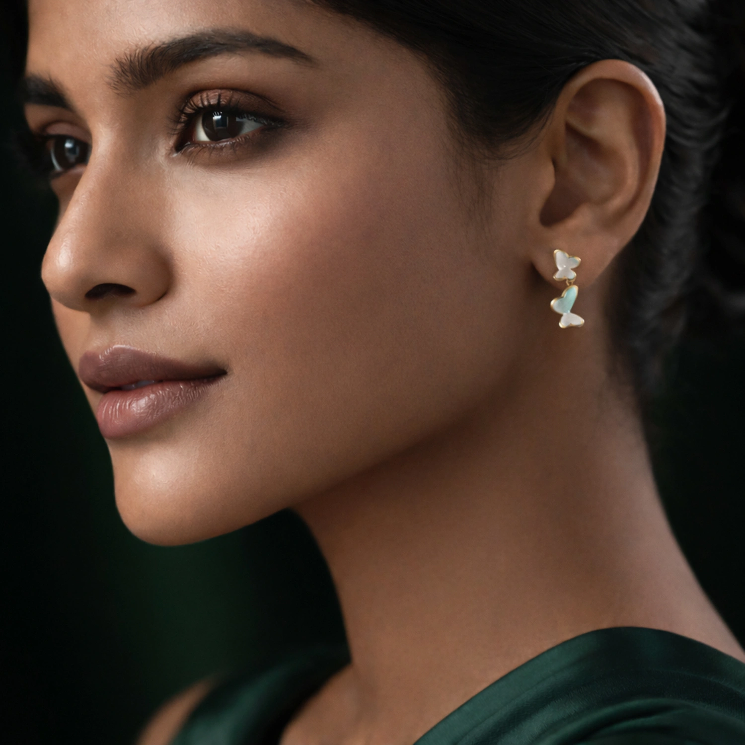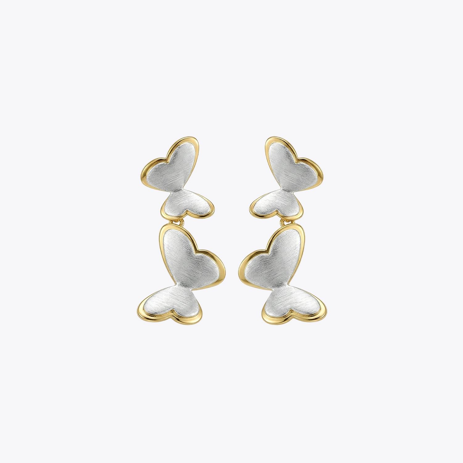 The Whimsical Twin Butterfly Drops are charming drop earrings crafted in gold-plated 925 sterling silver, featuring a playful stacked butterfly design that adds a soft, romantic touch to your look.