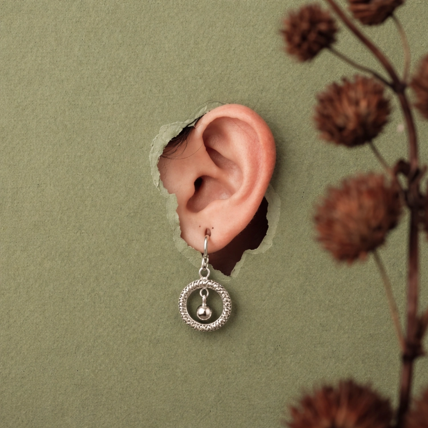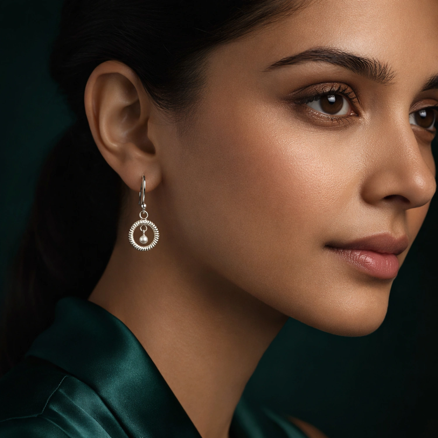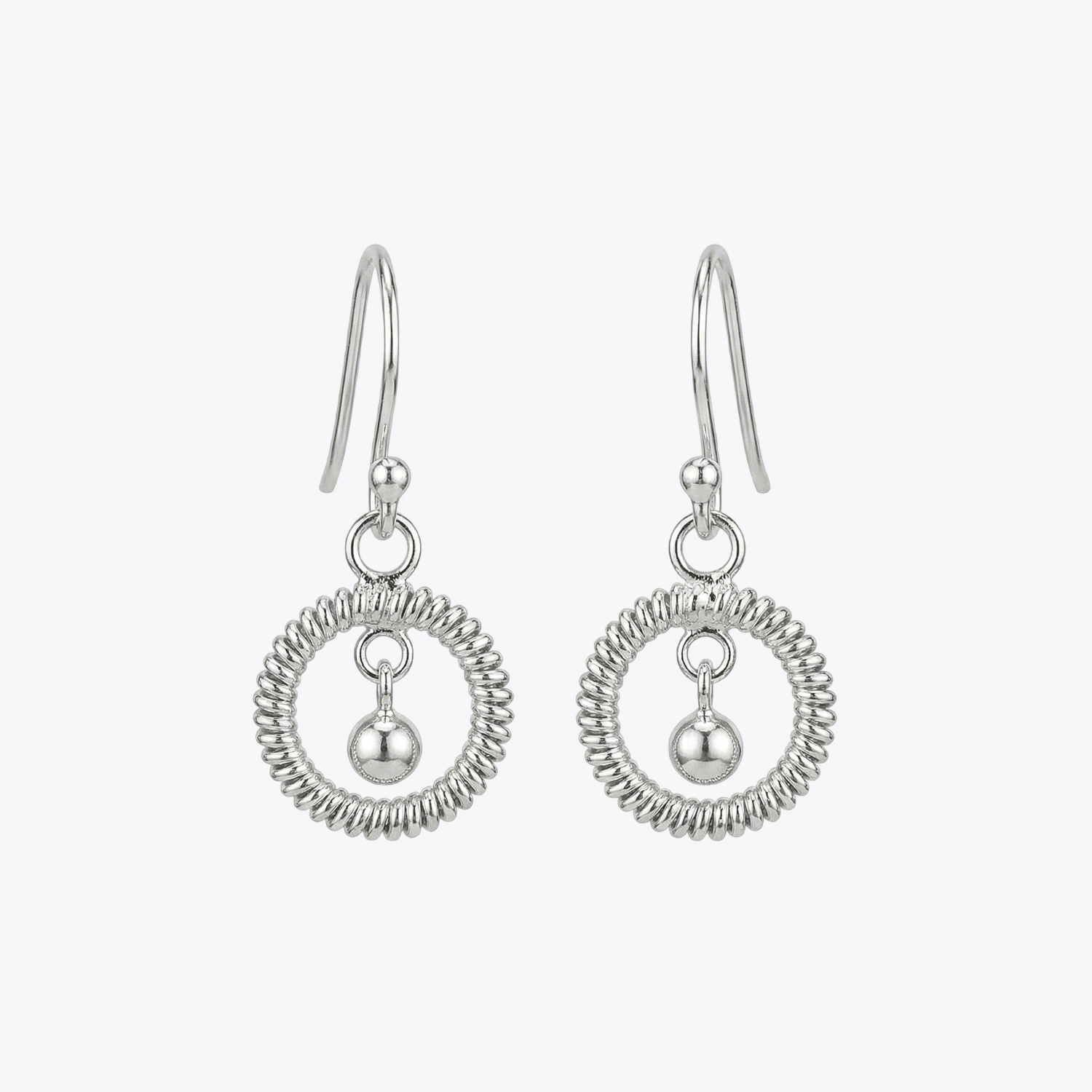 The Twisted Halo Silver Drop Earrings are elegant 925 sterling silver earrings featuring a textured rope-style hoop that cradles a softly swinging polished bead.
