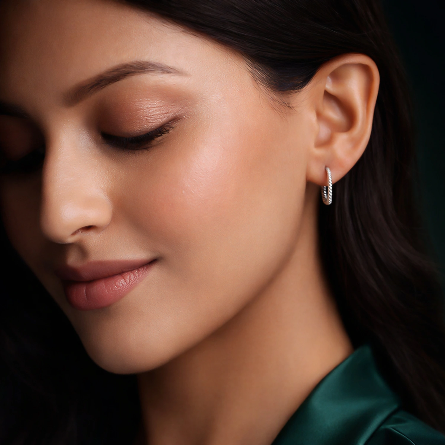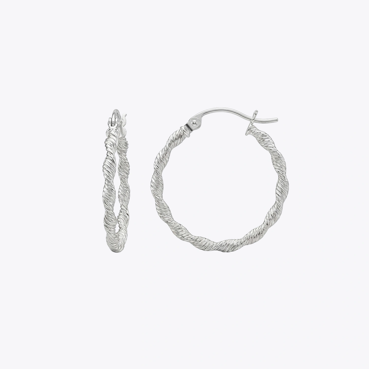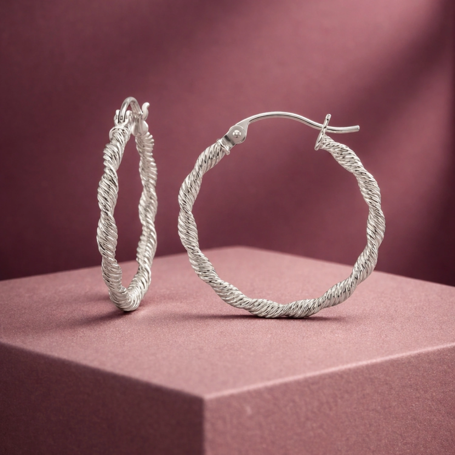The Twisted Silver Orbit Hoop Earrings are handcrafted 925 sterling silver hoops featuring a refined twisted texture for a sophisticated, dimensional look.